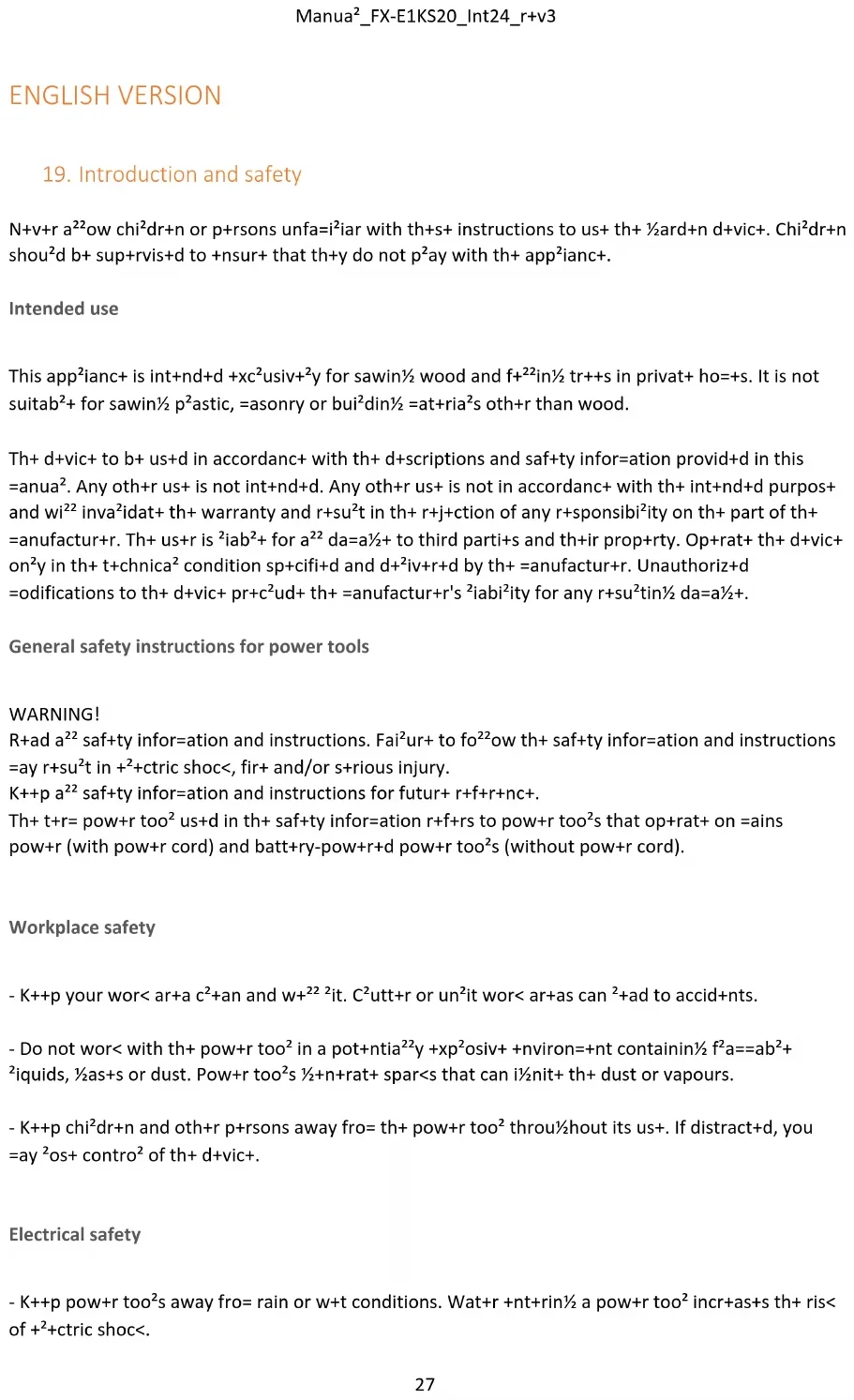 Use and handling of the power tool - Do not overload the device. Be sure to use the designated power tool for your work. With the right power tool, you will work better and safer in the specified power range. - Do not use a power tool whose switch is defective. A power tool that cannot be switched on or off is dangerous and must be repaired. - Unplug the power cord and/or remove the battery before making adjustments to the device, changing accessories or putting the device away. This precaution prevents the power tool from starting accidentally.Manual_FX-E1KS20_Int24_rev3