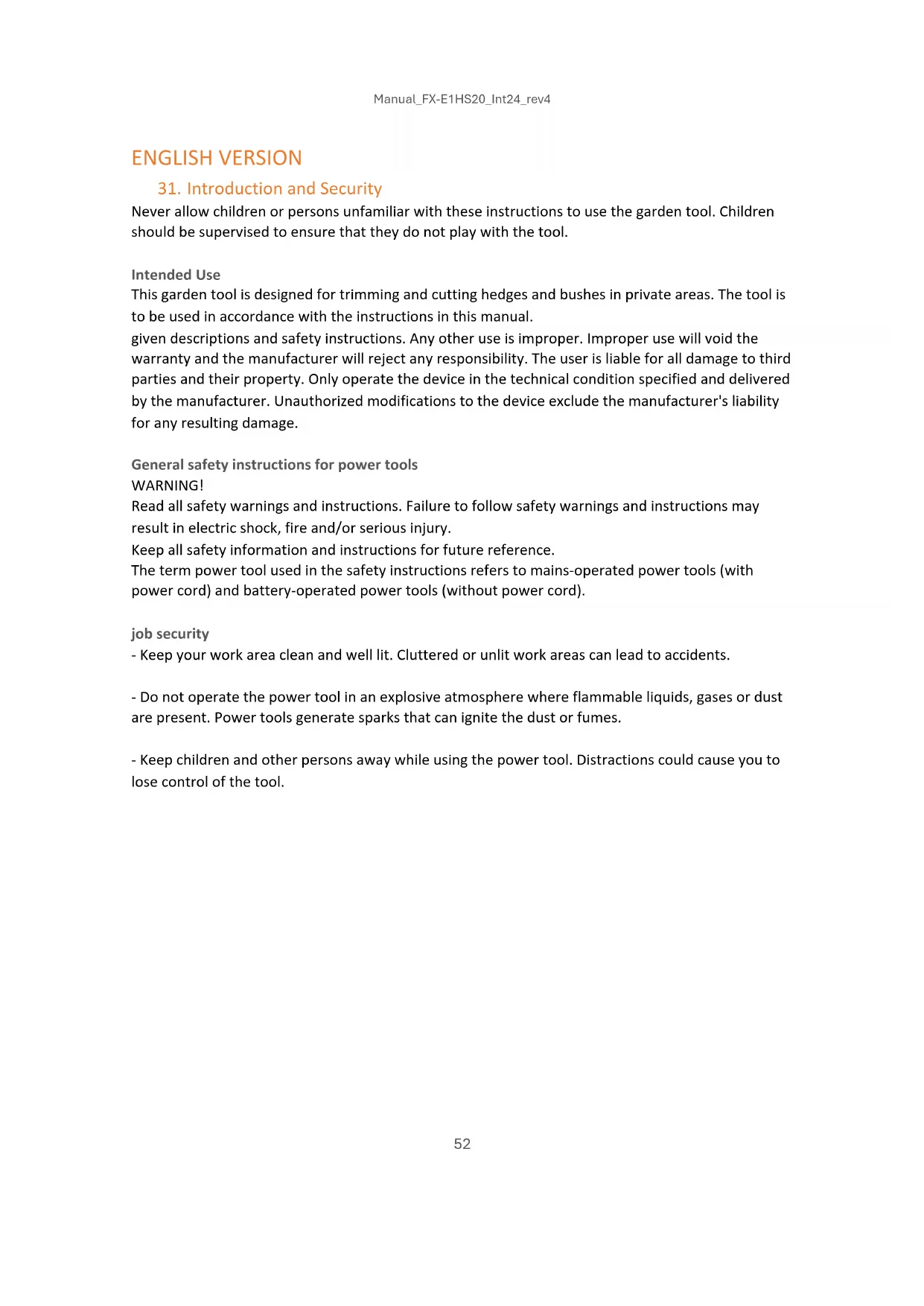 Never allow children or persons unfamiliar with these instructions to use the garden tool. Children should be supervised to ensure that they do not play with the tool. Intended Use This garden tool is designed for trimming and cutting hedges and bushes in private areas. The tool is to be used in accordance with the instructions in this manual. given descriptions and safety instructions. Any other use is improper. Improper use will void the warranty and the manufacturer will reject any responsibility. The user is liable for all damage to third parties and their property. Only operate the device in the technical condition specified and delivered by the manufacturer. Unauthorized modifications to the device exclude the manufacturer's liability for any resulting damage. General safety instructions for power tools WARNING! Read all safety warnings and instructions. Failure to follow safety warnings and instructions may result in electric shock, fire and/or serious injury. Keep all safety information and instructions for future reference. The term power tool used in the safety instructions refers to mains-operated power tools (with power cord) and battery-operated power tools (without power cord). job security - Keep your work area clean and well lit. Cluttered or unlit work areas can lead to accidents. - Do not operate the power tool in an explosive atmosphere where flammable liquids, gases or dust are present. Power tools generate sparks that can ignite the dust or fumes. - Keep children and other persons away while using the power tool. Distractions could cause you to lose control of the tool.Manual_FX-E1HS20_Int24_rev4