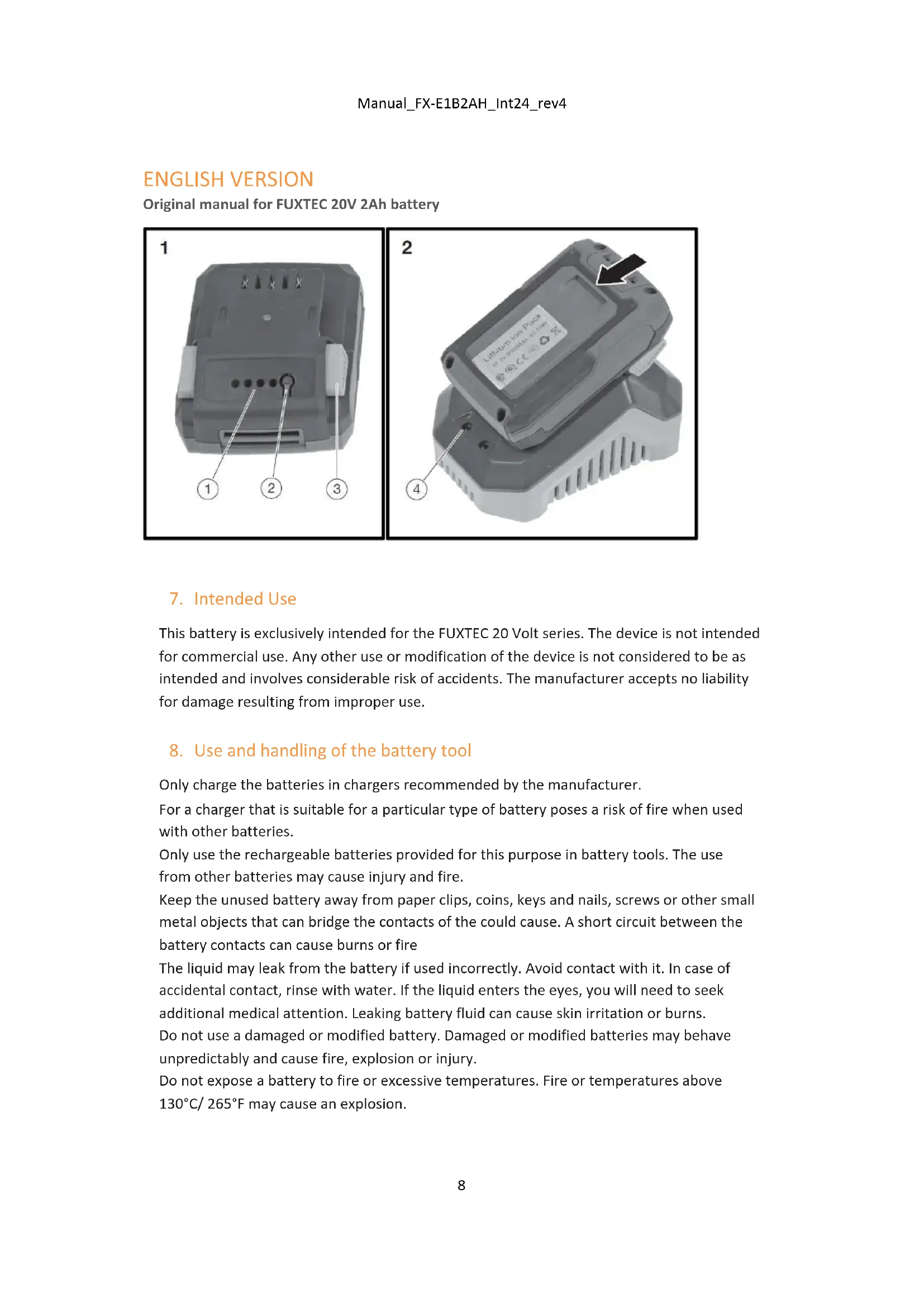 Only charge the batteries in chargers recommended by the manufacturer. For a charger that is suitable for a particular type of battery poses a risk of fire when used with other batteries. Only use the rechargeable batteries provided for this purpose in battery tools. The use from other batteries may cause injury and fire. Keep the unused battery away from paper clips, coins, keys and nails, screws or other small metal objects that can bridge the contacts of the could cause. A short circuit between the battery contacts can cause burns or fire The liquid may leak from the battery if used incorrectly. Avoid contact with it. In case of accidental contact, rinse with water. If the liquid enters the eyes, you will need to seek additional medical attention. Leaking battery fluid can cause skin irritation or burns. Do not use a damaged or modified battery. Damaged or modified batteries may behave unpredictably and cause fire, explosion or injury. Do not expose a battery to fire or excessive temperatures. Fire or temperatures above 130°C/ 265°F may cause an explosion.Manual_FX-E1B2AH_Int24_rev4