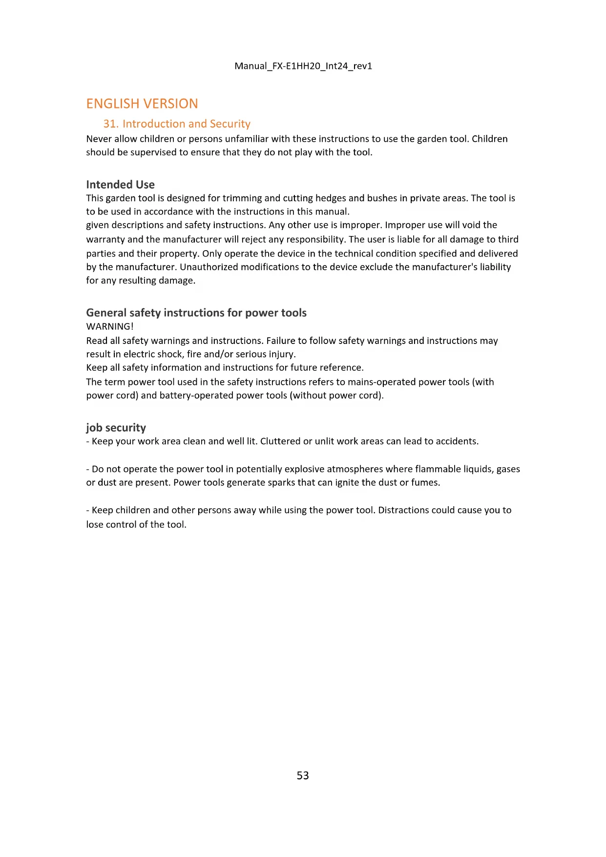 Never allow children or persons unfamiliar with these instructions to use the garden tool. Children should be supervised to ensure that they do not play with the tool. Intended Use This garden tool is designed for trimming and cutting hedges and bushes in private areas. The tool is to be used in accordance with the instructions in this manual. given descriptions and safety instructions. Any other use is improper. Improper use will void the warranty and the manufacturer will reject any responsibility. The user is liable for all damage to third parties and their property. Only operate the device in the technical condition specified and delivered by the manufacturer. Unauthorized modifications to the device exclude the manufacturer's liability for any resulting damage. General safety instructions for power tools WARNING! Read all safety warnings and instructions. Failure to follow safety warnings and instructions may result in electric shock, fire and/or serious injury. Keep all safety information and instructions for future reference. The term power tool used in the safety instructions refers to mains-operated power tools (with power cord) and battery-operated power tools (without power cord). job security - Keep your work area clean and well lit. Cluttered or unlit work areas can lead to accidents. - Do not operate the power tool in potentially explosive atmospheres where flammable liquids, gases or dust are present. Power tools generate sparks that can ignite the dust or fumes. - Keep children and other persons away while using the power tool. Distractions could cause you to lose control of the tool.Manual_FX-E1HH20_Int24_rev1