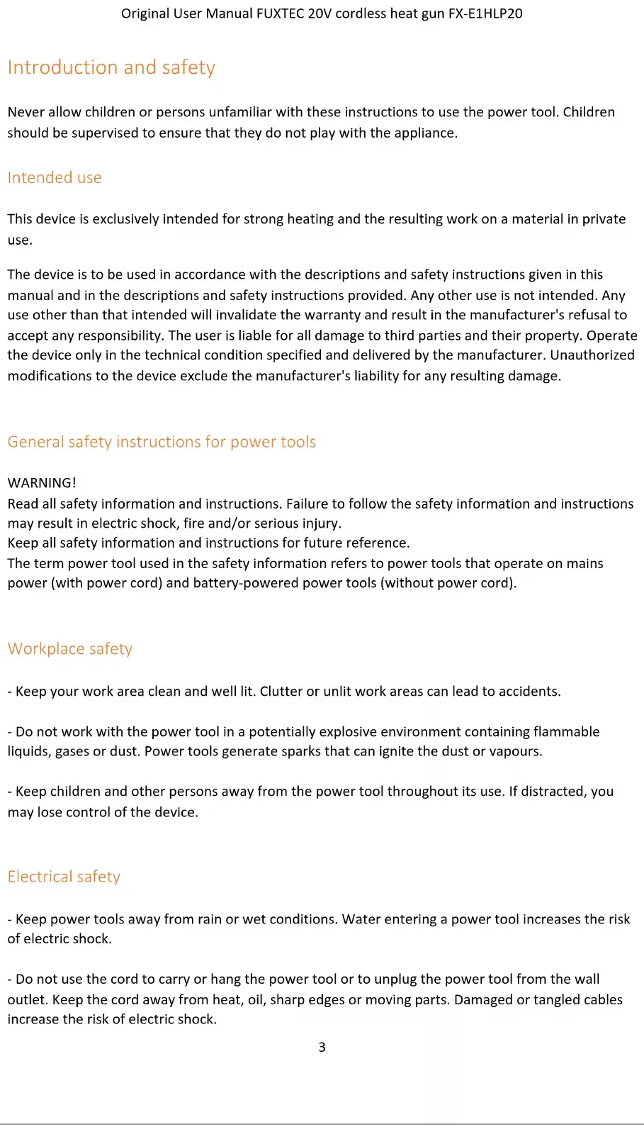 damaged parts repaired before using the device. Many accidents are caused by poorly maintained power tools. - Be sure to use power tools, accessories, insert tools, etc. according to these instructions. Take into account the working conditions and the task to be performed. The use of power tools for applications other than those intended can lead to dangerous situations. Use and handling of the cordless tool - Charge the batteries only with chargers recommended by the manufacturer. Using a charger that is suitable for a particular type of battery creates a fire hazard when used with other batteries. - Only use the rechargeable batteries in power tools that are designed for this purpose. Use of other batteries may cause injury and fire. - Keep the unused battery away from paper clips, coins, keys, nails, screws, or other small metal objects that could cause the contacts to bridge. A short circuit between the battery contacts may cause burns or fire. - Liquid may leak from the battery if used incorrectly. Avoid contact with it. In case of accidental contact, rinse with water. If the liquid gets into your eyes, seek additional medical attention. Leaking battery fluid may cause skin irritation or cause burns. Safety Instructions for Battery Hot Air Gun General safety information - For your safety and the safety of others, read this manual and its safety information before using the device. Please keep this manual and its safety information in a safe place for future reference and keep it handy for any operation. - Pass on the operating instructions with the device in the event of a change of ownership. - Persons operating the device must not be under the influence of intoxicating substances (e.g. alcohol, drugs or medicines). - Operate the device only in the conditions specified and supplied by the manufacturer. technical condition. Unauthorized modifications to the device exclude the manufacturer's liability for any resulting damage. - Only use the device in daylight or under good artificial lighting. - Only use the device in dry weather conditions. Keep it away from rain or moisture. Water ingress into the device increases the risk of electric shock.Original User Manual FUXTEC 20V cordless heat gun FX-E1HLP20