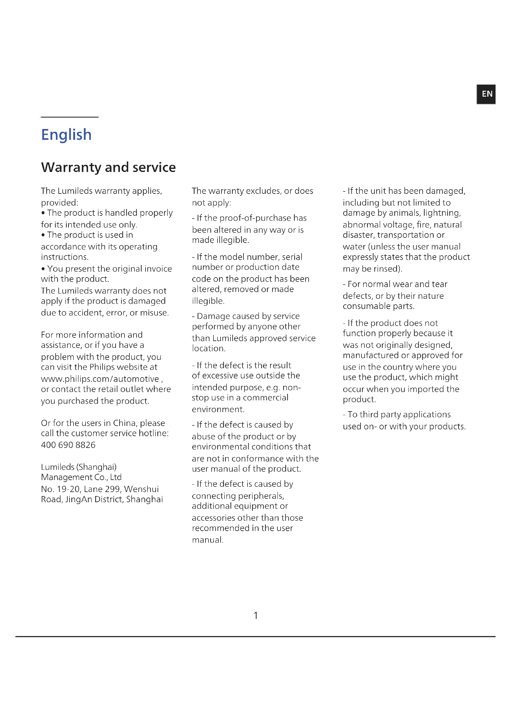 - You present the original invoice with the product. The Lumileds warranty does not apply if the product is damaged due to accident, error, or misuse. For more information and assistance, or if you have a problem with the product, you can visit the Philips website at www.philips.com/automotive , or contact the retail outlet where you purchased the product. Or for the users in China, please call the customer service hotline: