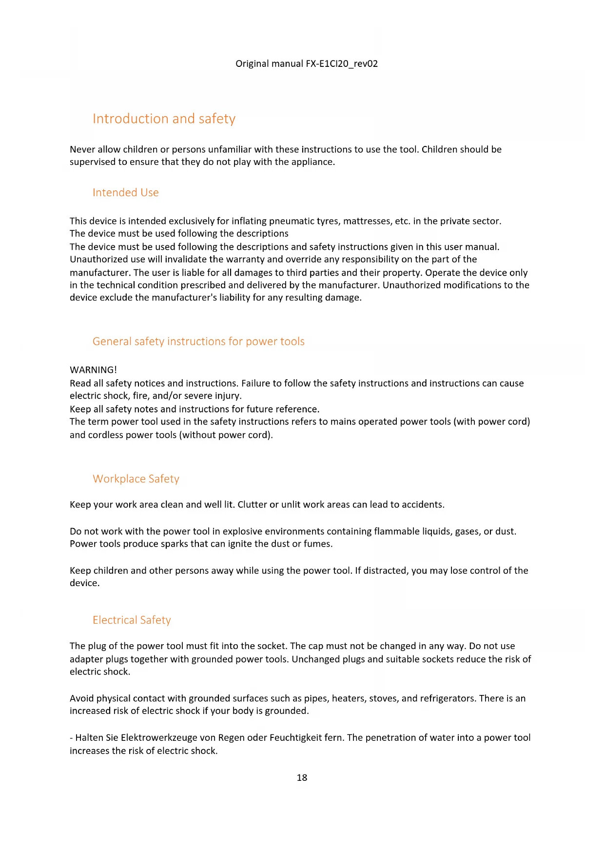 Workplace Safety Keep your work area clean and well lit. Clutter or unlit work areas can lead to accidents. Do not work with the power tool in explosive environments containing flammable liquids, gases, or dust. Power tools produce sparks that can ignite the dust or fumes. Keep children and other persons away while using the power tool. If distracted, you may lose control of the device. Electrical Safety The plug of the power tool must fit into the socket. The cap must not be changed in any way. Do not use adapter plugs together with grounded power tools. Unchanged plugs and suitable sockets reduce the risk of electric shock. Avoid physical contact with grounded surfaces such as pipes, heaters, stoves, and refrigerators. There is an increased risk of electric shock if your body is grounded. - Halten Sie Elektrowerkzeuge von Regen oder Feuchtigkeit fern. The penetration of water into a power tool increases the risk of electric shock.Original manual FX-E1CI20_rev02