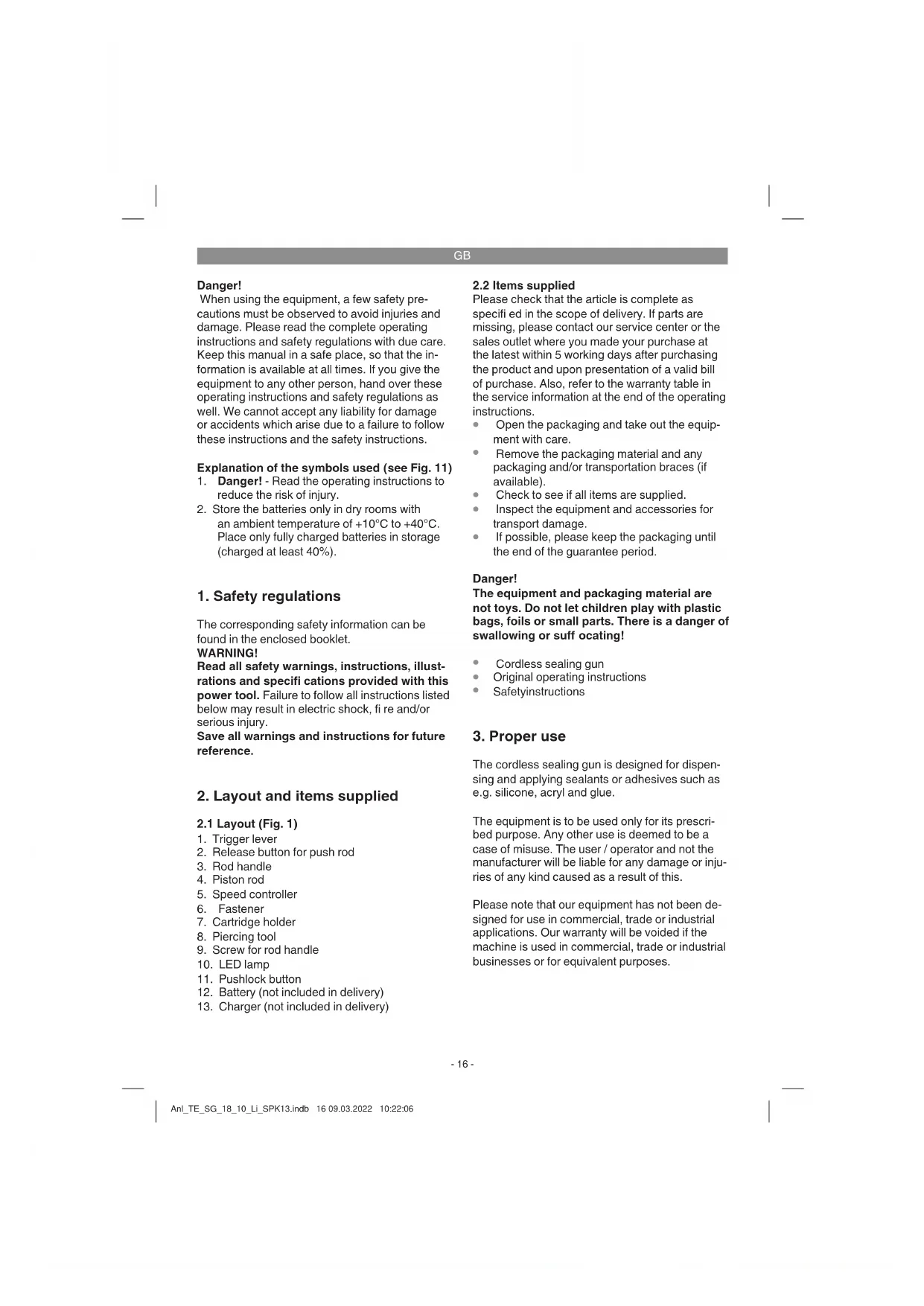 The cordless sealing gun is designed for dispen- sing and applying sealants or adhesives such as e.g. silicone, acryl and glue. The equipment is to be used only for its prescri- bed purpose. Any other use is deemed to be a case of misuse. The user / operator and not the manufacturer will be liable for any damage or inju- ries of any kind caused as a result of this. Please note that our equipment has not been de- signed for use in commercial, trade or industrial applications. Our warranty will be voided if the machine is used in commercial, trade or industrial businesses or for equivalent purposes. Anl_TE_SG_18_10_Li_SPK13.indb 16 09.03.2022 10:22:06GB
