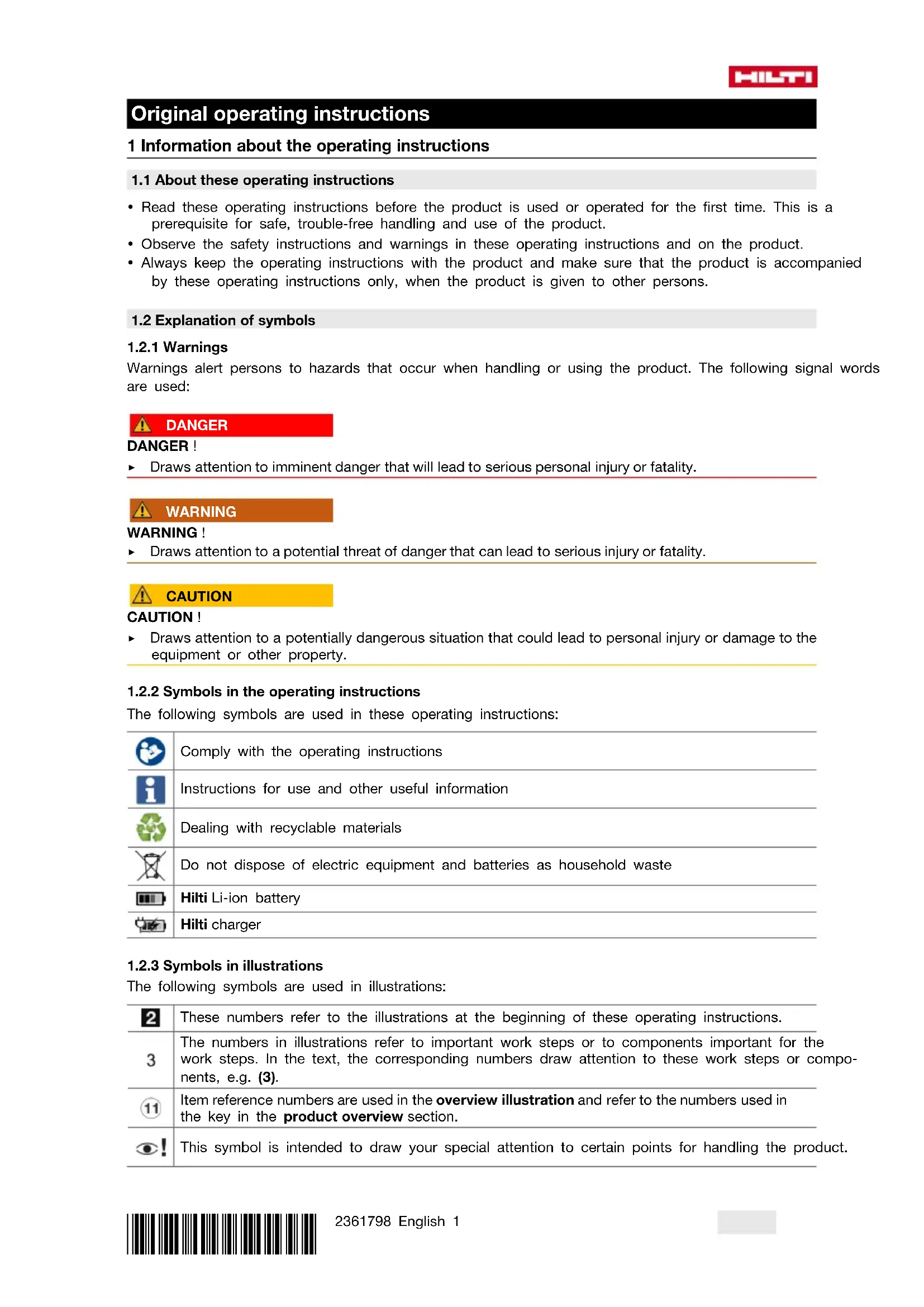 The following symbols are used in these operating instructions: Comply with the operating instructions Instructions for use and other useful information Dealing with recyclable materials Do not dispose of electric equipment and batteries as household waste Hilti Liion battery Hilti charger