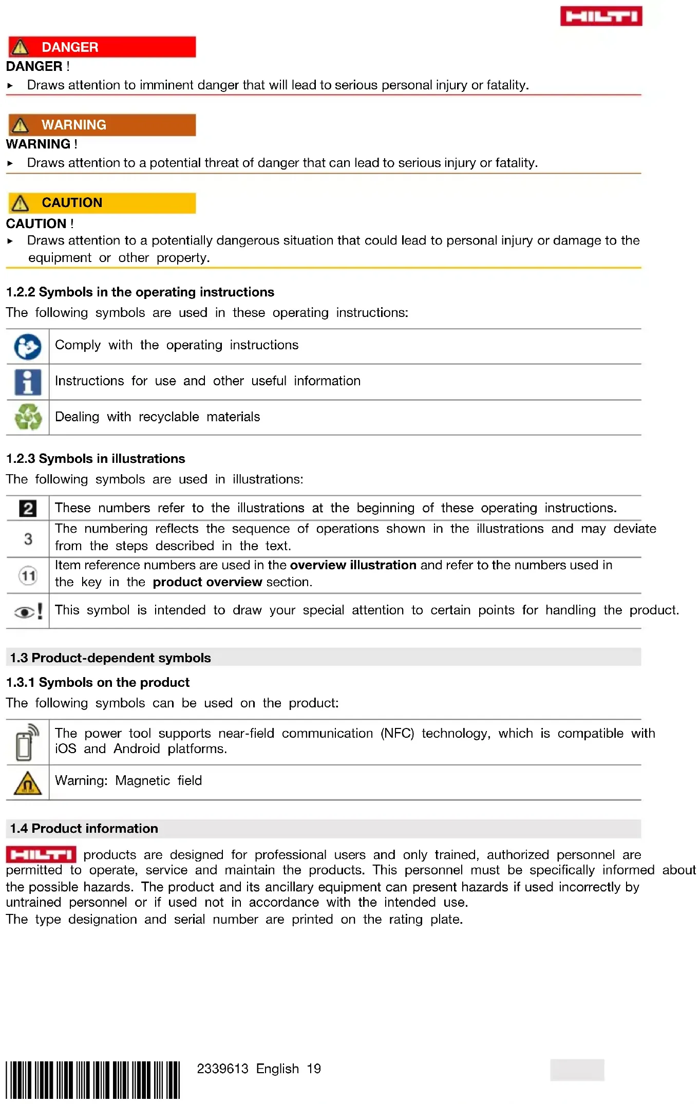Warnings alert persons to hazards that occur when handling or using the product. The following signal words are used:*2339613* 2339613 English 19 DANGER DANGER ! ▶ Draws attention to imminent danger that will lead to serious personal injury or fatality. WARNING WARNING ! ▶ Draws attention to a potential threat of danger that can lead to serious injury or fatality. CAUTION CAUTION ! ▶ Draws attention to a potentially dangerous situation that could lead to personal injury or damage to the equipment or other property.