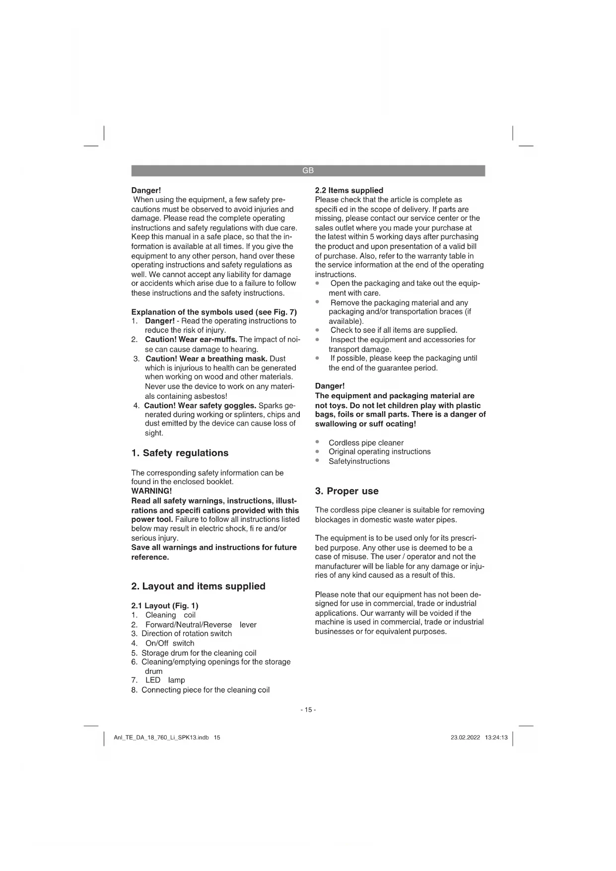 The cordless pipe cleaner is suitable for removing blockages in domestic waste water pipes. The equipment is to be used only for its prescri- bed purpose. Any other use is deemed to be a case of misuse. The user / operator and not the manufacturer will be liable for any damage or inju- ries of any kind caused as a result of this. Please note that our equipment has not been de- signed for use in commercial, trade or industrial applications. Our warranty will be voided if the machine is used in commercial, trade or industrial businesses or for equivalent purposes. Anl_TE_DA_18_760_Li_SPK13.indb 15Anl_TE_DA_18_760_Li_SPK13.indb 15 23.02.2022 13:24:1323.02.2022 13:24:13GB