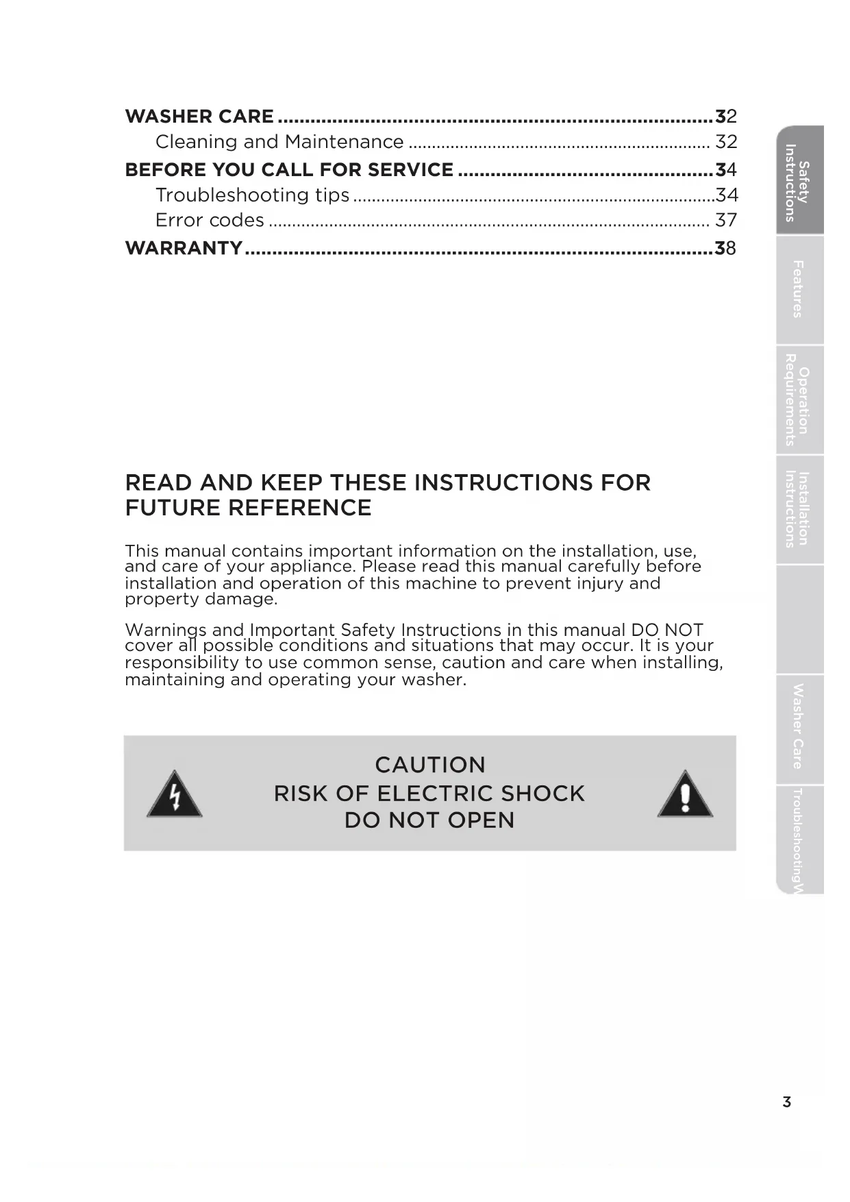Safety InstructionsFeaturesOperation RequirementsInstallation InstructionsWasher CareTroubleshootingWasher UseSafety Instructions Features Operation Requirements Installation Instructions Washer Care TroubleshootingWasher UseWARNING This symbol indicates that there are important operating and maintenance instructions in the literature accompanying your washing machine. CAUTION This indicates that hazards or unsafe practices may cause minor personal injury or property damage. WARNING This indicates that hazards or unsafe practices may cause serious personal injury or death. To reduce the risk of fire, explosion, electric shock or personal injury when using your washing machine, you SHOULD follow these basic safety precautions. WARNING State of California Proposition 65 Warnings. The california Safe Drinking Water and Toxic Enforcement Act requires the Governor of California to publish a list of substances known to the State of california to cause cancer, birth defects or other reproductive harm and requires businesses to warn of potential exposure to such substances. This product contains a chemical known to the State of California to cause cancer, birth defects or other reproductive harm. This appliance can cause low-Ievel exposure to some of the substances listed, including benzene, formaldehyde and carbon monoxide. Cancer and Reproductive Harm - www.P65Warnings.ca.gov.