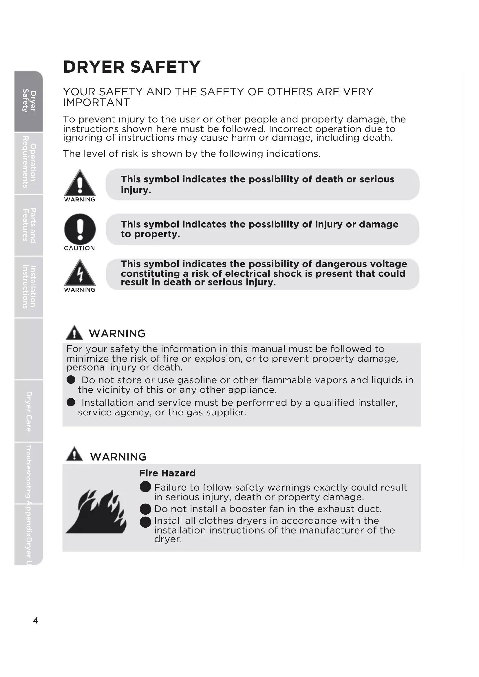 Dryer SafetyOperation RequirementsParts and FeaturesInstallation Instructions Dryer CareTroubleshooting AppendixDryer UseCAUTIONWARNING This symbol indicates the possibility of death or serious injury. This symbol indicates the possibility of injury or damage to property. WARNING This symbol indicates the possibility of dangerous voltage constituting a risk of electrical shock is present that could result in death or serious injury. WARNING For your safety the information in this manual must be followed to minimize the risk of fire or explosion, or to prevent property damage, personal injury or death. ● Do not store or use gasoline or other flammable vapors and liquids in the vicinity of this or any other appliance. ● Installation and service must be performed by a qualified installer, service agency, or the gas supplier. WARNING Fire Hazard
