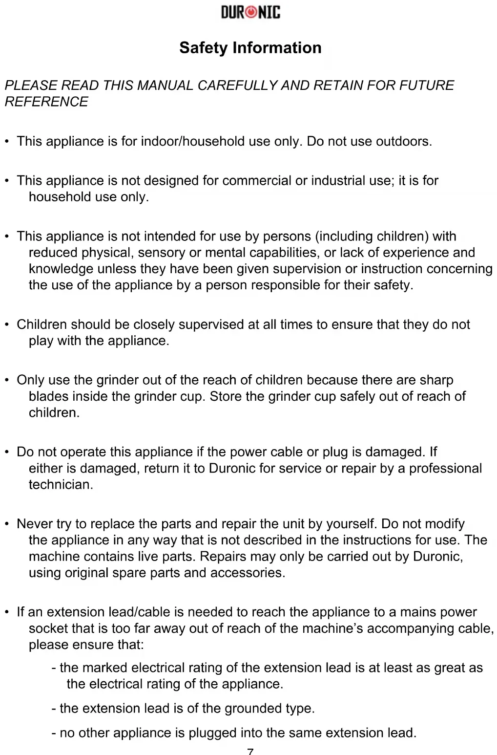 - Never try to replace the parts and repair the unit by yourself. Do not modify the appliance in any way that is not described in the instructions for use. The machine contains live parts. Repairs may only be carried out by Duronic, using original spare parts and accessories.