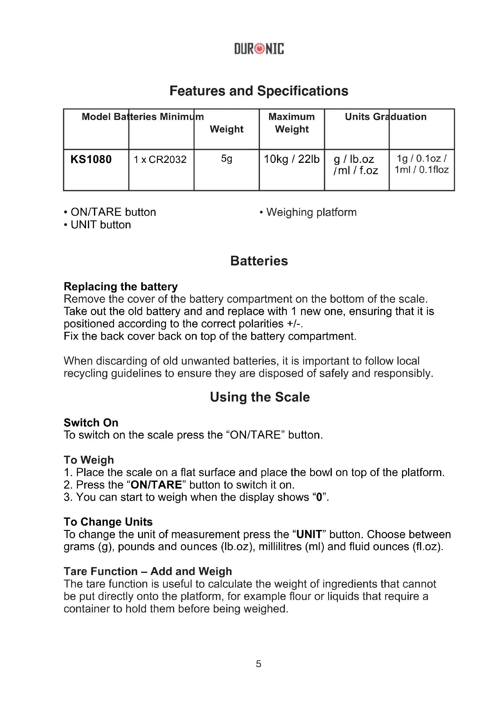 - Weighing platform6 The tare function is also useful for weighing different ingredients into the measuring bowl as you go along, for instance once you’ve added the rst ingredient to weigh, press the “ON/TARE” button and the scale will return to zero “0”, which allows you then weight the next ingredient accurately. Automatic Switch Off The scale will automatically switch off after 60 seconds of no use. Manual Switch Off You can manually switch the scale off at any time by pressing and holding the “ON/TARE” button for 2 seconds. Cleaning and Care When using this scale, please ensure it is used on a dry, at even surface. The scale is not waterproof, therefore should not be exposed to moisture or submerged under water. To clean the scale, use a slightly damp cloth to wipe over it. Do not use any chemical or abrasive cleaning products to clean the scale. If you plan to not use the scale for a long time, remove the batteries before storing away. Low battery This symbol gives advance warning that the battery will run out soon. No battery power remaining This means it’s time to change the batteries. Unstable weight This is shown when weight is not stablised or the scale is not on an even surface. Overload This means that the maximum weight limit has been exceeded. Remove some ingredients to prevent damaging the scale.7 Warranty 1 Year Guarantee from Shine-Mart Ltd, Trademark owners of Duronic Products. NOTE: THESE STATEMENTS DO NOT AFFECT YOUR STATUTORY RIGHTS AS A CONSUMER This product has been manufactured under the strictest or quality control procedures, and using the highest quality of materials, to ensure excellent performance and reliability. It will give very good and long lasting service, provided it is properly used and maintained. The product is guaranteed for 1 years from the date of original purchase. If any defect arises due to a faulty materials or poor workmanship, the faulty product must be returned to the original place of purchase. Refund or replacement is at the discretion of that company. Duronic Products are offered with a 1 year guarantee under the following conditions: