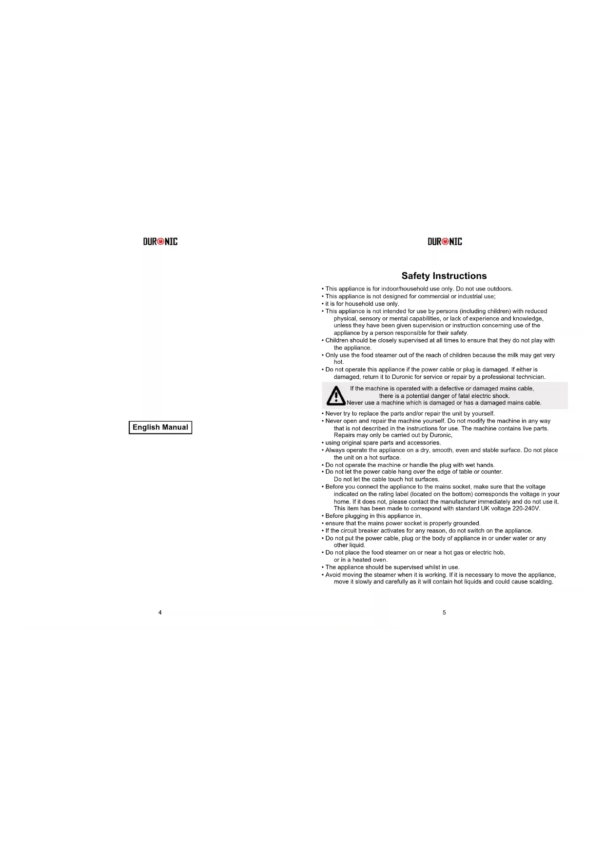 - Never open and repair the machine yourself. Do not modify the machine in any way that is not described in the instructions for use. The machine contains live parts. Repairs may only be carried out by Duronic,