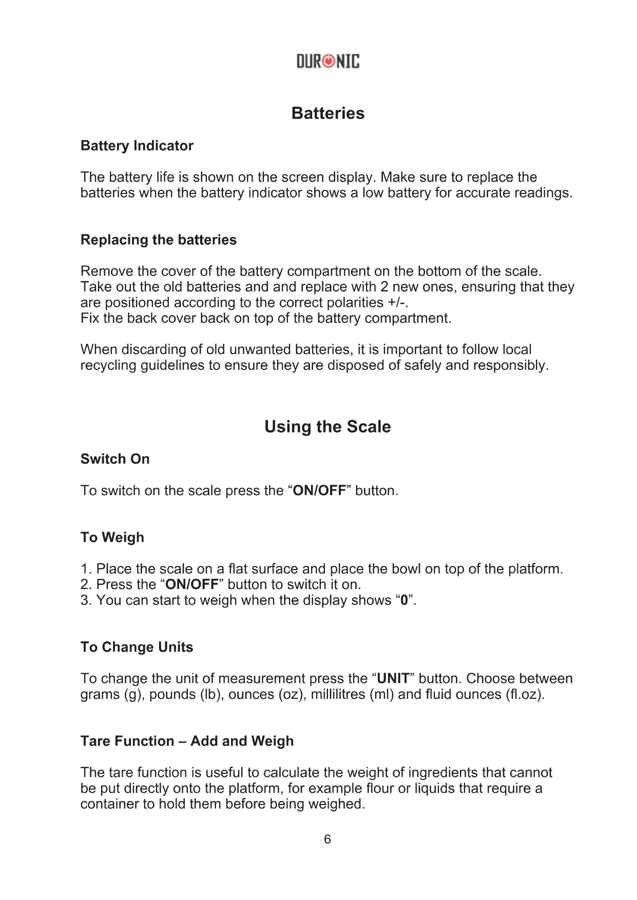 To Change Units To change the unit of measurement press the “UNIT” button. Choose between grams (g), pounds (lb), ounces (oz), millilitres (ml) and uid ounces (.oz). Tare Function – Add and Weigh The tare function is useful to calculate the weight of ingredients that cannot be put directly onto the platform, for example our or liquids that require a container to hold them before being weighed.7 The tare function is also useful for weighing different ingredients into the measuring bowl as you go along, for instance once you’ve added the rst ingredient to weigh, press the “ON/OFF” button and the scale will return to zero “0”, which allows you then weight the next ingredient accurately. Automatic Switch Off The scale will automatically switch off after 60 seconds of no use. Manual Switch Off You can manually switch the scale off at any time by pressing and holding the “ON/OFF” button for 2 seconds. Cleaning and Care When using this scale, please ensure it is used on a dry, at even surface. The scale is not waterproof, therefore should not be exposed to moisture or submerged under water. To clean the scale, use a slightly damp cloth to wipe over it. Do not use any chemical or abrasive cleaning products to clean the scale. If you plan to not use the scale for a long time, remove the batteries before storing away. Low battery This symbol gives advance warning that the battery will run out soon. No battery power remaining This means it’s time to change the batteries. Negative weight This is shown when weight is lifted off of the platform while the scale is under the Tare setting. Overload This means that the maximum weight limit has been exceeded. Remove some ingredients to prevent damaging the scale.8 Warranty 1 Year Guarantee from Shine-Mart Ltd, Trademark owners of Duronic Products. NOTE: THESE STATEMENTS DO NOT AFFECT YOUR STATUTORY RIGHTS AS A CONSUMER This product has been manufactured under the strictest or quality control procedures, and using the highest quality of materials, to ensure excellent performance and reliability. It will give very good and long lasting service, provided it is properly used and maintained. The product is guaranteed for 1 years from the date of original purchase. If any defect arises due to a faulty materials or poor workmanship, the faulty product must be returned to the original place of purchase. Refund or replacement is at the discretion of that company. Duronic Products are offered with a 1 year guarantee under the following conditions: