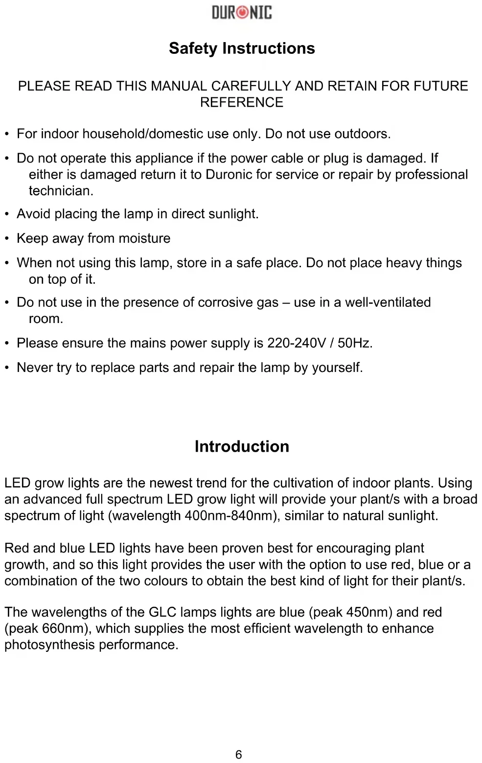 - Never try to replace parts and repair the lamp by yourself. LED grow lights are the newest trend for the cultivation of indoor plants. Using an advanced full spectrum LED grow light will provide your plant/s with a broad spectrum of light (wavelength 400nm-840nm), similar to natural sunlight. Red and blue LED lights have been proven best for encouraging plant growth, and so this light provides the user with the option to use red, blue or a combination of the two colours to obtain the best kind of light for their plant/s. The wavelengths of the GLC lamps lights are blue (peak 450nm) and red (peak 660nm), which supplies the most efcient wavelength to enhance photosynthesis performance. Introduction7 Remove packaging and check you have everything that should be in the box. The GLC is a light with a clip on the base which enables you to clip the light to any surface near your plant pot. There is a light control pad which enables you to adjust the brightness, choose between red light, blue light or a mixture of red and blue light together. Memory Function The lamp will stay on the same setting that you had it on when you last switched it off. For instance, if you set it to a red light and the highest brightness, when you next switch the lamp on it will return to the same bright red light setting. If you turn off the power at the plug socket, the lamp will reset and not remember the last setting it was on. Using Your Grow Light Specications Model Number