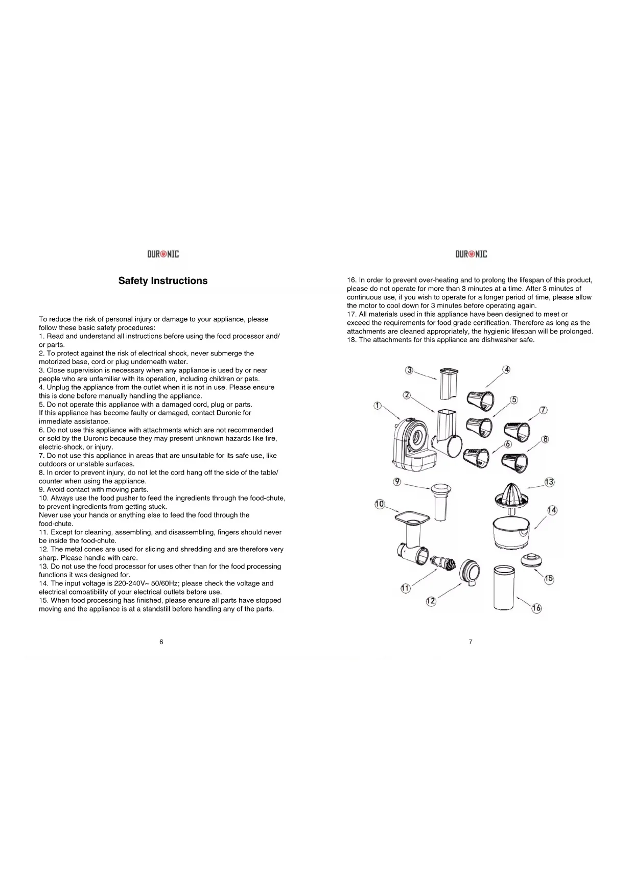pulp, and the juice will drip down from the spout into the containment bowl. Cleaning Never submerge the motor and its housing in water or other liquids. To clean, use a damp cloth, and dry it thereafter with a dry cloth. All other parts and attachments may be cleaned with a soft brush. The attachments are also dishwasher safe, but any part that has an attached metal component should NEVER be placed in a microwave for sterilization.12 13 Warranty 1 Year Guarantee from Shine-Mart Ltd, Trademark owners of Duronic Products. NOTE: THESE STATEMENTS DO NOT AFFECT YOUR STATUTORY RIGHTS AS A CONSUMER This product has been manufactured under the strictest or quality control procedures, and using the highest quality of materials, to ensure excellent performance and reliability. It will give very good and long lasting service, provided it is properly used and maintained. The product is guaranteed for 1 years from the date of original purchase. If any defect arises due to a faulty materials or poor workmanship, the faulty product must be returned to the original place of purchase. Refund or replacement is at the discretion of that company. Duronic Products are offered with a 1 year guarantee under the following conditions: