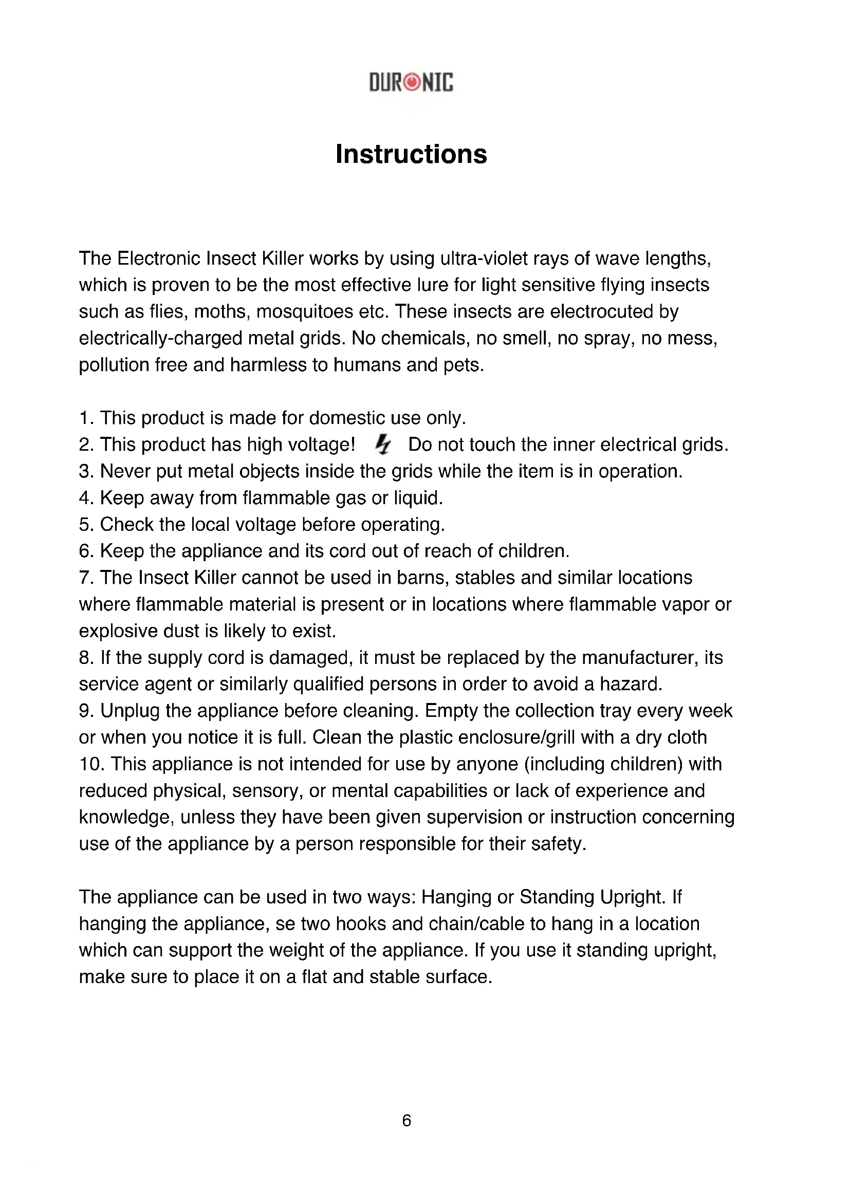 English Manual6 Instructions The Electronic Insect Killer works by using ultra-violet rays of wave lengths, which is proven to be the most effective lure for light sensitive ying insects such as ies, moths, mosquitoes etc. These insects are electrocuted by electrically-charged metal grids. No chemicals, no smell, no spray, no mess, pollution free and harmless to humans and pets.