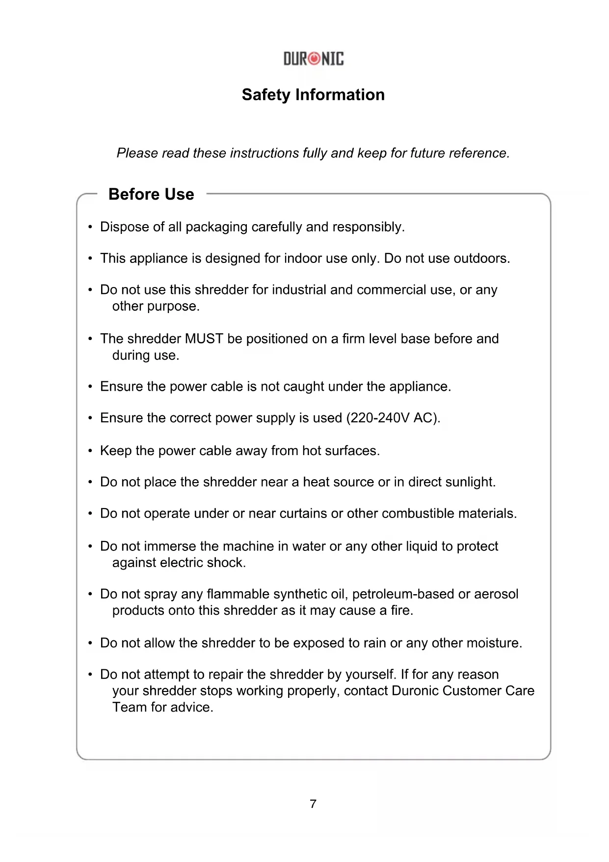 - Do not attempt to repair the shredder by yourself. If for any reason your shredder stops working properly, contact Duronic Customer Care Team for advice. Before Use8