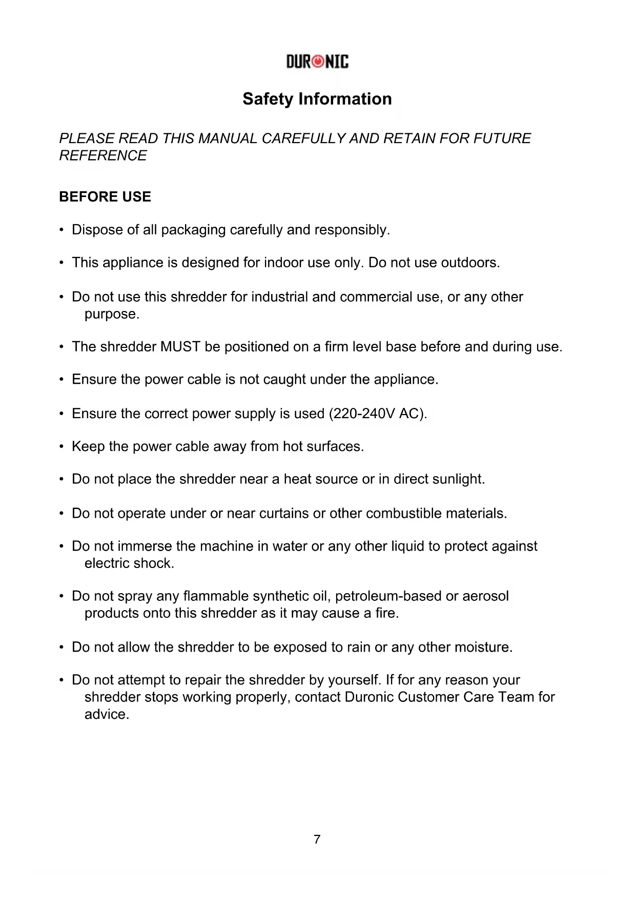 - Do not attempt to repair the shredder by yourself. If for any reason your shredder stops working properly, contact Duronic Customer Care Team for advice. Safety Information8 DURING USE