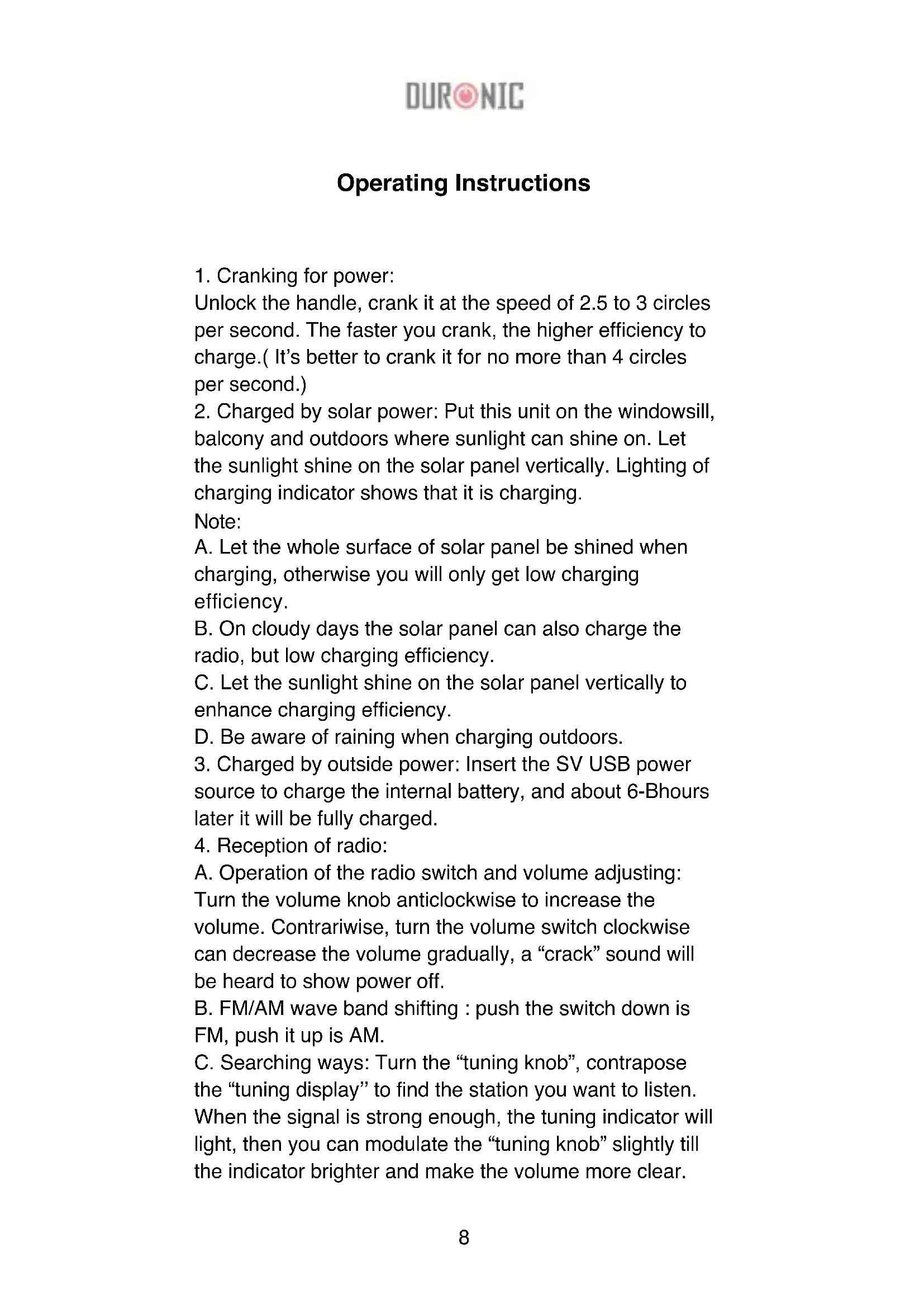 English Manual6 Introduction Sensitivity of the FM: ≥10 uV Sensitivity of the AM Better than 1.5mV/m Reception scope of the FM: 88-108 MHz Reception scope of the AM: 530-1650KHz The audio frequency output power: ≥100 mW Radio working time after 1 min of cranking (2.5 - 3 circles/s): ≈ 20 minutes Radio working time after 5 hours charging under sunlight ≈ 30 minutes Max. electricity by solar panel charging: 40mA Time to full-charge by solar panel: 20-30 hours Radio working time after being charged fully ≈ 7 hours Input voltage: 5V Fully Charged Time ≈ 8 hours Charging Outside Power Frequency band and Transmission power Switch: 5000 times Whole unit: 5 years Plastic parts: 5 years Main Parts Life Span Antenna length (external part) ≈ 33mm Product size ≈ 130*73*41mm Product weight ≈ 203g Size and Weight Specication of built-in battery: 300mAh, 2.4v Diameter of built-in loudhailer: 40mm Others7 Product Diagram Charging Indicator Wave Band Converting Switch Earphone Jack Mini USB Socket Tuning Display & Display Pointer Tuning Indicator Solar Panel Tuning Knob Volume Knob Handle Head of Handle Telescoping Antenna8 Operating Instructions