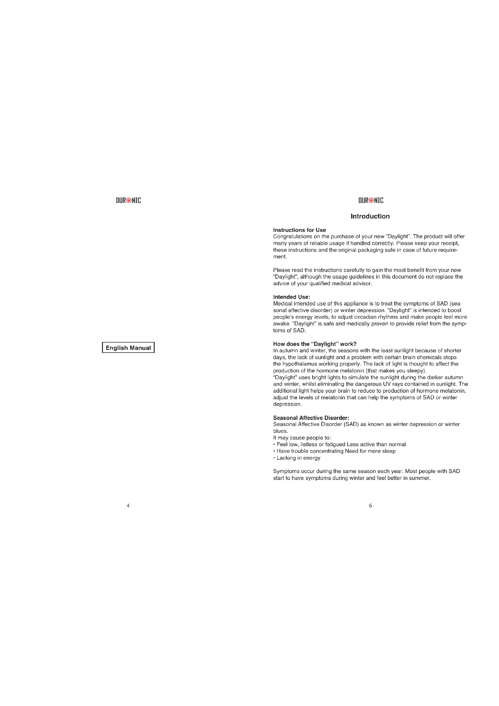 Contents4 5 English Manual Introduction Instructions for Use Congratulations on the purchase of your new “Daylight”. The product will offer many years of reliable usage if handled correctly. Please keep your receipt, these instructions and the original packaging safe in case of future require- ment. Please read the instructions carefully to gain the most benet from your new “Daylight”, although the usage guidelines in this document do not replace the advice of your qualied medical advisor. Intended Use: Medical intended use of this appliance is to treat the symptoms of SAD (sea- sonal affective disorder) or winter depression. “Daylight” is intended to boost people’s energy levels, to adjust circadian rhythms and make people feel more awake. “Daylight” is safe and medically proven to provide relief from the symp- toms of SAD. How does the “Daylight” work? In autumn and winter, the seasons with the least sunlight because of shorter days, the lack of sunlight and a problem with certain brain chemicals stops the hypothalamus working properly. The lack of light is thought to affect the production of the hormone melatonin (that makes you sleepy). “Daylight” uses bright lights to simulate the sunlight during the darker autumn and winter, whilst eliminating the dangerous UV rays contained in sunlight. The additional light helps your brain to reduce to production of hormone melatonin, adjust the levels of melatonin that can help the symptoms of SAD or winter depression. Seasonal Affective Disorder: Seasonal Affective Disorder (SAD) as known as winter depression or winter blues. It may cause people to: