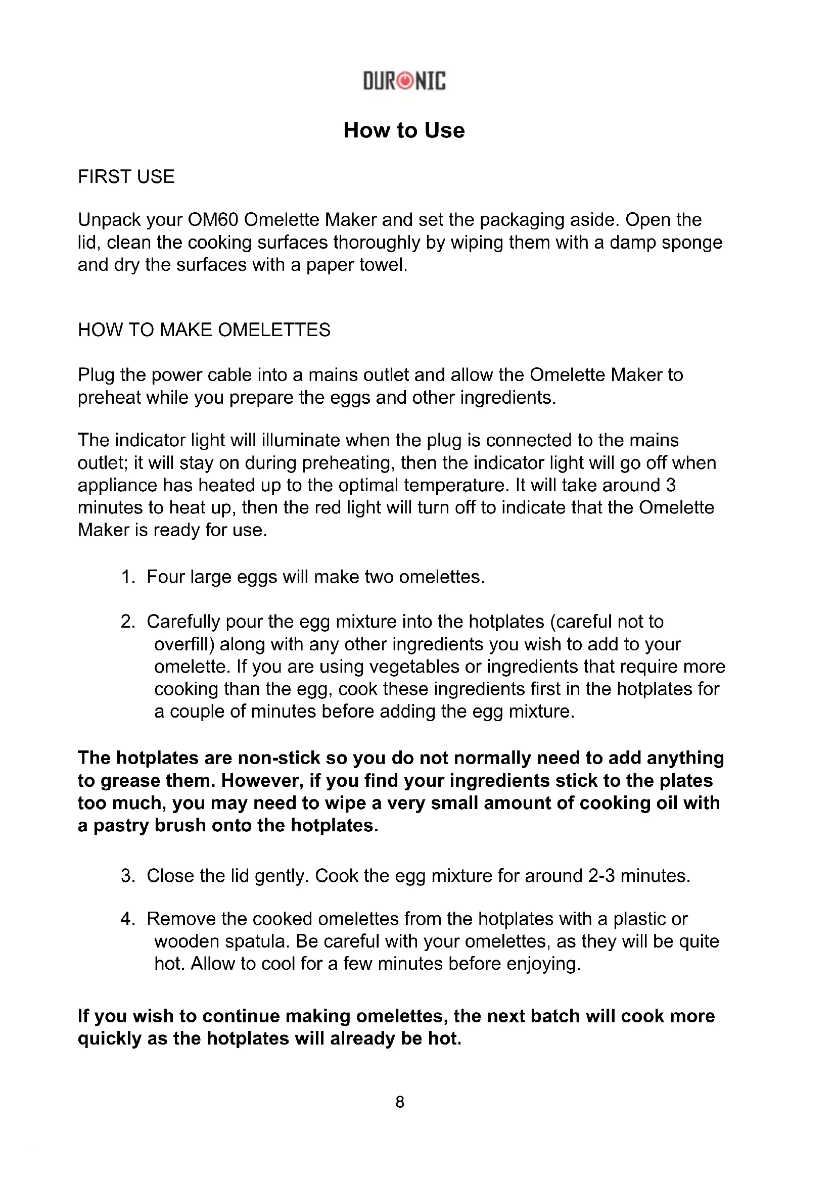 OM60 600W 220-240V / 50Hz Features and Specications8 How to Use FIRST USE Unpack your OM60 Omelette Maker and set the packaging aside. Open the lid, clean the cooking surfaces thoroughly by wiping them with a damp sponge and dry the surfaces with a paper towel.