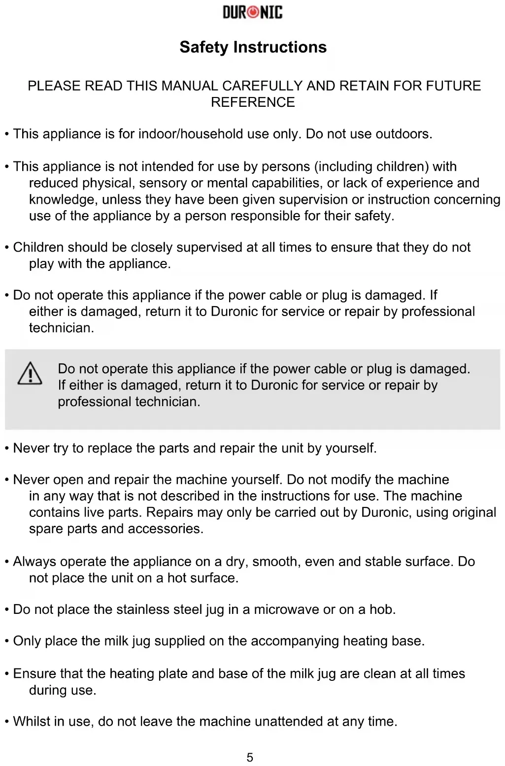 - Whilst in use, do not leave the machine unattended at any time. Do not operate this appliance if the power cable or plug is damaged. If either is damaged, return it to Duronic for service or repair by professional technician.6