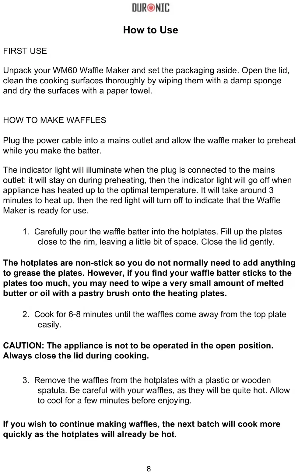 WM60 1200W 220-240V / 50Hz Features and Specications8 How to Use FIRST USE Unpack your WM60 Wafe Maker and set the packaging aside. Open the lid, clean the cooking surfaces thoroughly by wiping them with a damp sponge and dry the surfaces with a paper towel.