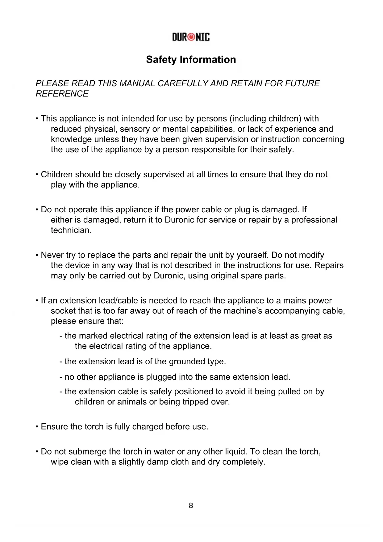 - Do not operate this appliance if the power cable or plug is damaged. If either is damaged, return it to Duronic for service or repair by a professional technician.