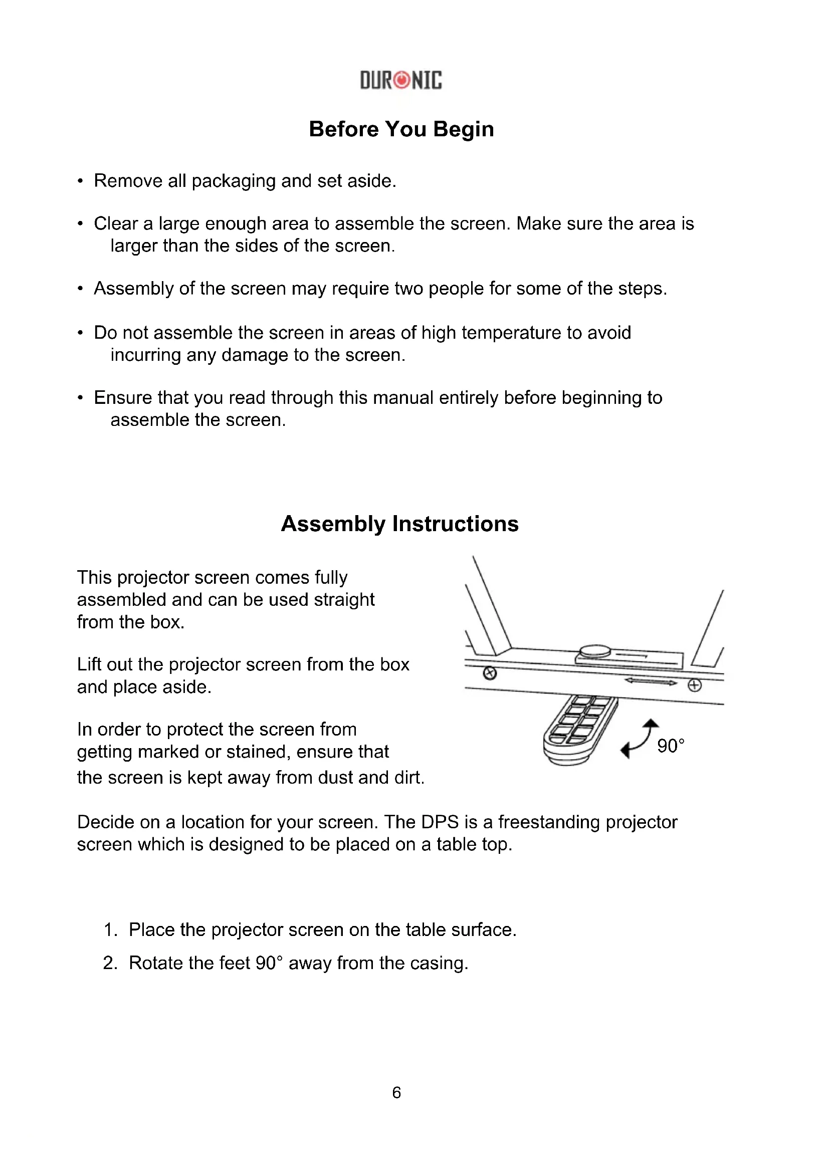 - Ensure that you read through this manual entirely before beginning to assemble the screen. This projector screen comes fully assembled and can be used straight from the box. Lift out the projector screen from the box and place aside. In order to protect the screen from getting marked or stained, ensure that the screen is kept away from dust and dirt. Decide on a location for your screen. The DPS is a freestanding projector screen which is designed to be placed on a table top.
