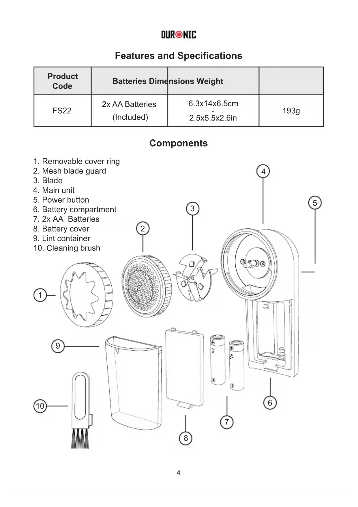 Low Motor Speed Low battery power Replace the batteries Lint container is full Empty the lint container Blade is obstructed by lint Remove the cover ring and mesh guard and clean around the blade using the brush provided Efciency is not how you would like it The cover ring has not been adapted to the lint level Rotate the cover ring to adjust the position Motor speed is low Check the batteries and if exhausted replace them with new batteries Check the lint container13 Warranty 1 Year Guarantee from Shine-Mart Ltd, Trademark owners of Duronic Products. NOTE: THESE STATEMENTS DO NOT AFFECT YOUR STATUTORY RIGHTS AS A CONSUMER This product has been manufactured under the strictest or quality control procedures, and using the highest quality of materials, to ensure excellent performance and reliability. It will give very good and long lasting service, provided it is properly used and maintained. The product is guaranteed for 1 years from the date of original purchase. If any defect arises due to a faulty materials or poor workmanship, the faulty product must be returned to the original place of purchase. Refund or replacement is at the discretion of that company. Duronic Products are offered with a 1 year guarantee under the following conditions: