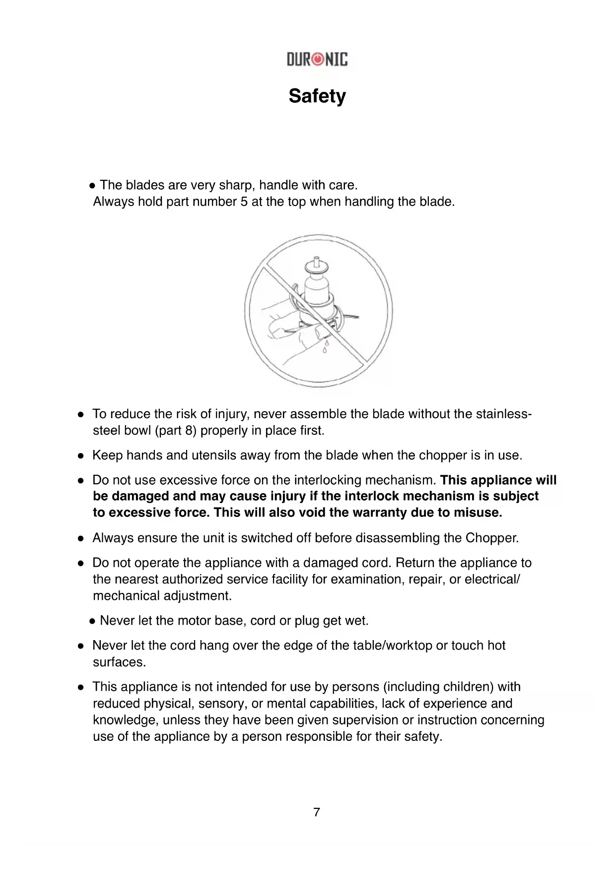 Safety ● The blades are very sharp, handle with care. Always hold part number 5 at the top when handling the blade. ● To reduce the risk of injury, never assemble the blade without the stainless- steel bowl (part 8) properly in place rst. ● Keep hands and utensils away from the blade when the chopper is in use. ● Do not use excessive force on the interlocking mechanism. This appliance will be damaged and may cause injury if the interlock mechanism is subject to excessive force. This will also void the warranty due to misuse. ● Always ensure the unit is switched off before disassembling the Chopper. ● Do not operate the appliance with a damaged cord. Return the appliance to the nearest authorized service facility for examination, repair, or electrical/ mechanical adjustment. ● Never let the motor base, cord or plug get wet. ● Never let the cord hang over the edge of the table/worktop or touch hot surfaces. ● This appliance is not intended for use by persons (including children) with reduced physical, sensory, or mental capabilities, lack of experience and knowledge, unless they have been given supervision or instruction concerning use of the appliance by a person responsible for their safety.8 ● Children should be supervised to ensure that they do not play with the appliance. ● Do not use outdoors. This product is made for indoor domestic use only. Duronic will not accept any liability if the appliance is subject to improper use, or failure to comply with these instructions. ● To protect against the risk of an electrical shock, do not put the motor base in water or other liquids. ● The use of attachments not recommended or sold by the manufacturer may cause re, electric shock, or injury. ● Make sure the cover is securely locked in place before operating appliance. *Before plugging in* Make sure your household voltage corresponds with the rating label on the product.9 The knife blade unit comes in 2 parts, a lower and an upper blade. ● For coarser chopping use the lower blade on its own. ● For ne chopping or to make puree, use both blades together. This will also achieve faster results. How to assemble the silicon ring. To use your food chopper Soft press for pulse Press full for continuous use Press Install the silicon ring into the inside of the lid then press the ring by hand until it is xed on. Note: After processing food, the upper blade may disengage from the lower blade. This is normal as the blade assembly is designed to be loose to ease separation after use.10