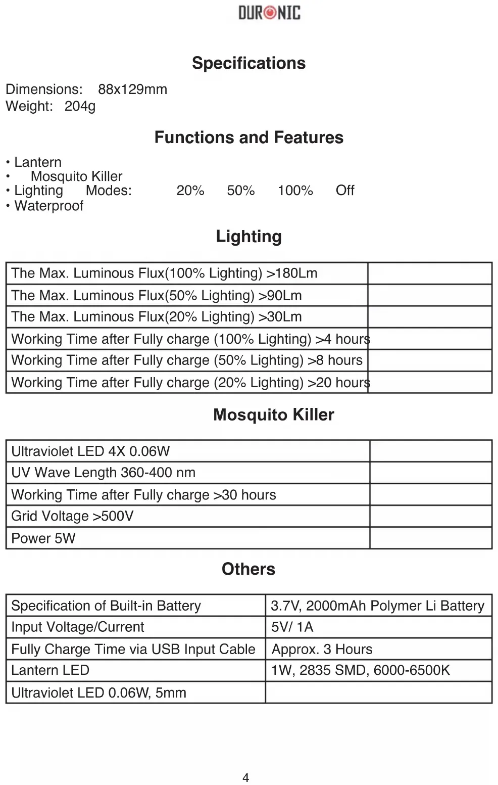 - Waterproof Lighting Functions and Features Specications Mosquito Killer Others The Max. Luminous Flux(100% Lighting) >180Lm The Max. Luminous Flux(50% Lighting) >90Lm The Max. Luminous Flux(20% Lighting) >30Lm Working Time after Fully charge (100% Lighting) >4 hours Working Time after Fully charge (50% Lighting) >8 hours Working Time after Fully charge (20% Lighting) >20 hours Ultraviolet LED 4X 0.06W UV Wave Length 360-400 nm Working Time after Fully charge >30 hours Grid Voltage >500V Power 5W Specication of Built-in Battery 3.7V, 2000mAh Polymer Li Battery Input Voltage/Current 5V/ 1A Fully Charge Time via USB Input Cable Approx. 3 Hours Lantern LED 1W, 2835 SMD, 6000-6500K Ultraviolet LED 0.06W, 5mm5 Structural Diagram Cleaning Operation Method Lantern: Press the “Lantern” Switch to shift lighting mode, from 20% lighting, 50% lighting, 100% lighting and Off. Caution