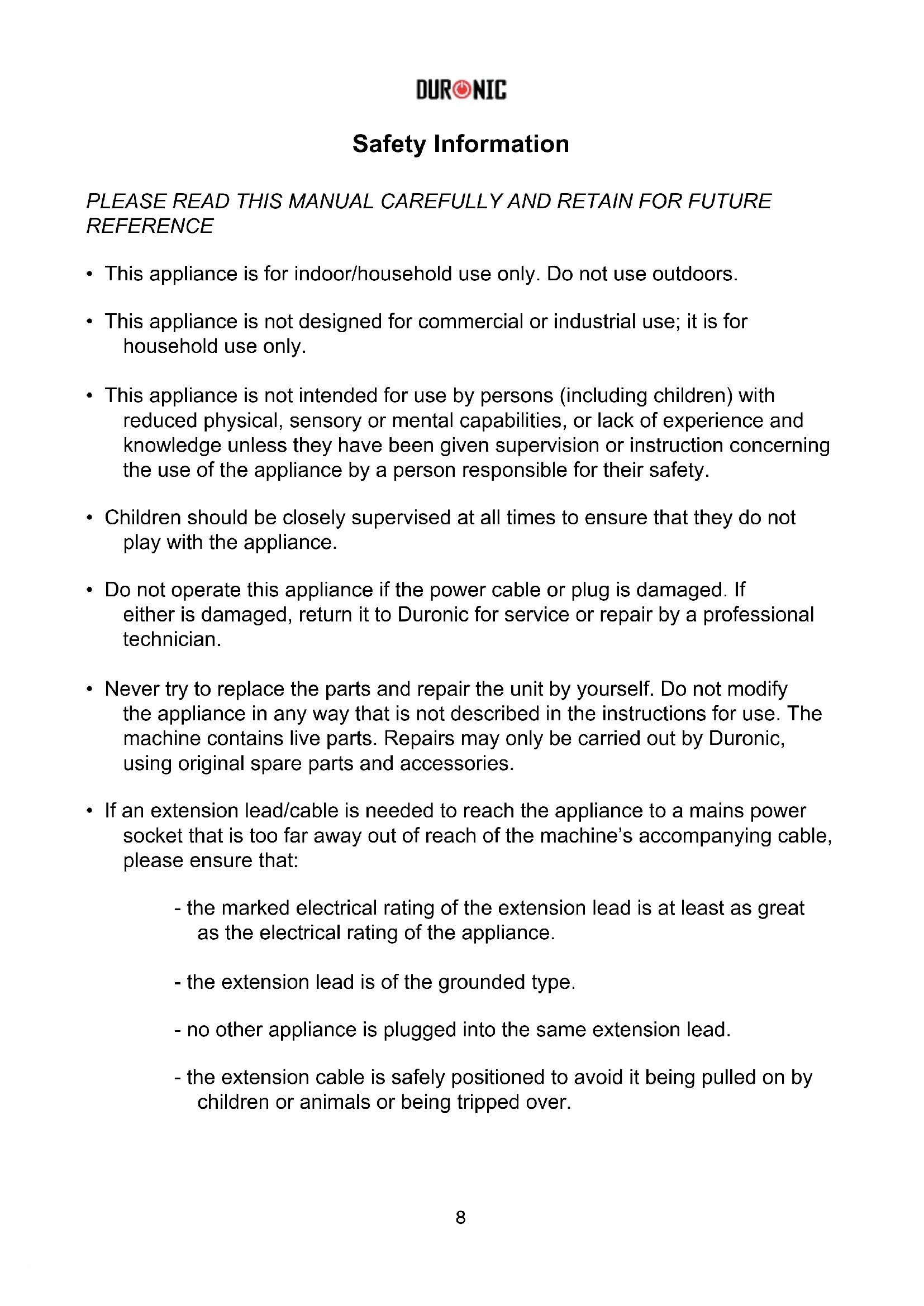 - Do not operate this appliance if the power cable or plug is damaged. If either is damaged, return it to Duronic for service or repair by a professional technician.