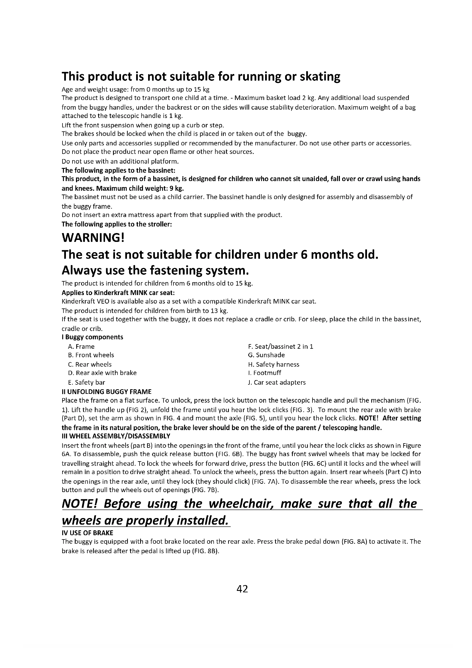 Alle Rechte an dieser Studie liegen vollständig bei 4Kraft Sp. z o.o. Jede nicht autorisierte Verwendung, die ihrem beabsichtigten Zweck widerspricht, insbesondere: Verwendung, Kopieren, Reproduktion, Weitergabe - ganz oder teilweise ohne Zustimmung von 4Kraft Sp. z o.o. kann rechtliche Konsequenzen haben. Dear Customers, Thank you for purchasing a Kinderkraft product. Our products have been designed for your child's safety and comfort. The buggy is an ideal solution for those who value quality, modernity and functionality. Please read the manual carefully and follow its recommendations. Important – Read carefully and keep for future reference A. Safety and care notes WARNING! Never leave the child unattended Ensure that all the locking devices are engaged before use To avoid injury ensure that the child is kept away when unfolding and folding this product Do not let the child play with this product Check that the pram body or seat unit or car seat attachment devices are correctly engaged before use42 This product is not suitable for running or skating Age and weight usage: from 0 months up to 15 kg The product is designed to transport one child at a time. - Maximum basket load 2 kg. Any additional load suspended from the buggy handles, under the backrest or on the sides will cause stability deterioration. Maximum weight of a bag attached to the telescopic handle is 1 kg. Lift the front suspension when going up a curb or step. The brakes should be locked when the child is placed in or taken out of the buggy. Use only parts and accessories supplied or recommended by the manufacturer. Do not use other parts or accessories. Do not place the product near open flame or other heat sources. Do not use with an additional platform. The following applies to the bassinet: This product, in the form of a bassinet, is designed for children who cannot sit unaided, fall over or crawl using hands and knees. Maximum child weight: 9 kg. The bassinet must not be used as a child carrier. The bassinet handle is only designed for assembly and disassembly of the buggy frame. Do not insert an extra mattress apart from that supplied with the product. The following applies to the stroller: WARNING! The seat is not suitable for children under 6 months old. Always use the fastening system. The product is intended for children from 6 months old to 15 kg. Applies to Kinderkraft MINK car seat: Kinderkraft VEO is available also as a set with a compatible Kinderkraft MINK car seat. The product is intended for children from birth to 13 kg. If the seat is used together with the buggy, it does not replace a cradle or crib. For sleep, place the child in the bassinet, cradle or crib. I Buggy components A. Frame B. Front wheels C. Rear wheels D. Rear axle with brake E. Safety bar F. Seat/bassinet 2 in 1 G. Sunshade H. Safety harness