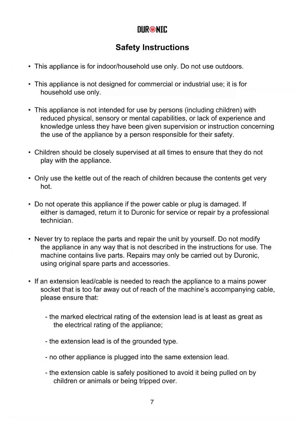 - Do not operate this appliance if the power cable or plug is damaged. If either is damaged, return it to Duronic for service or repair by a professional technician.