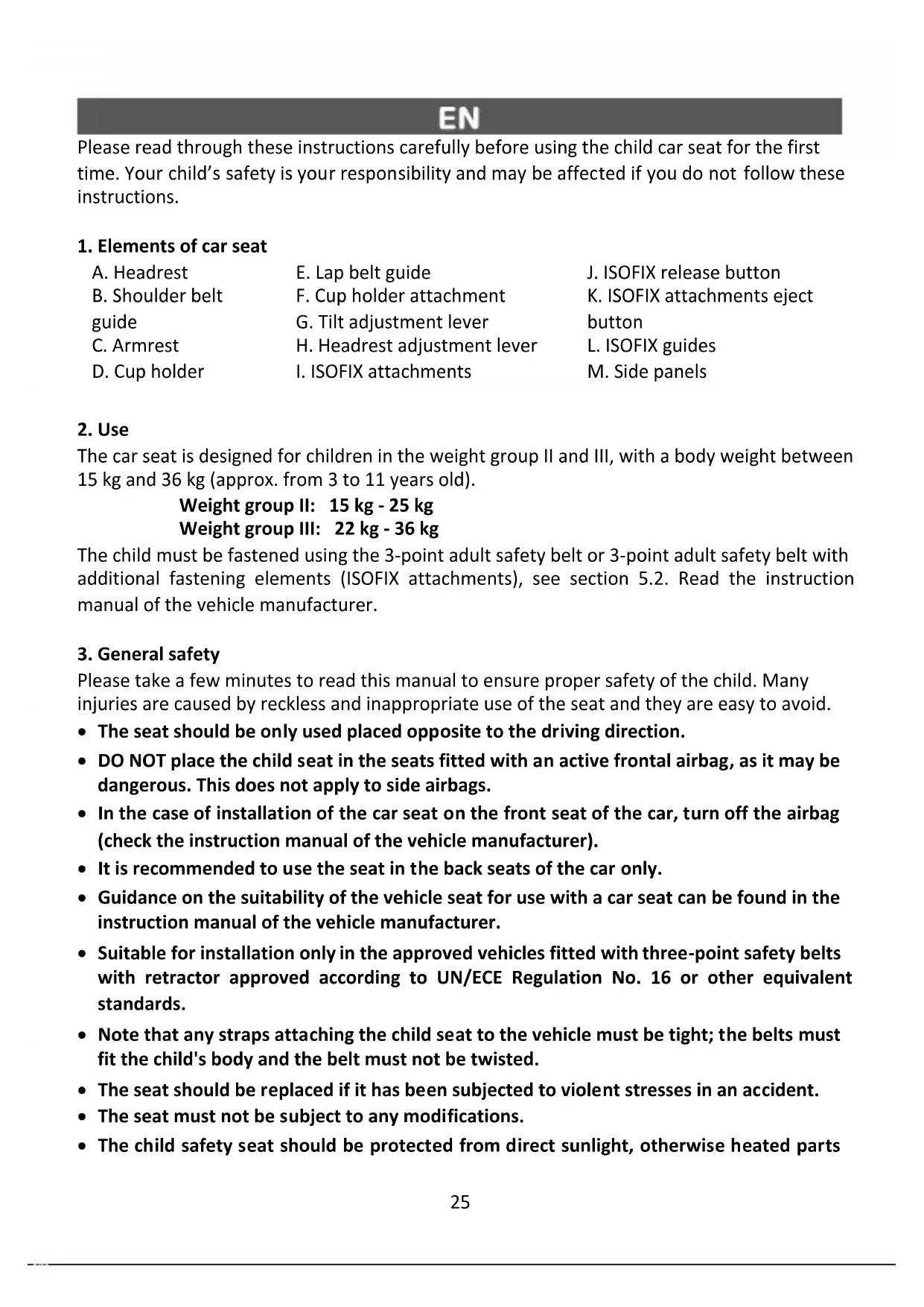 The car seat is designed for children in the weight group II and III, with a body weight between 15 kg and 36 kg (approx. from 3 to 11 years old). Weight group II: 15 kg - 25 kg Weight group III: 22 kg - 36 kg The child must be fastened using the 3-point adult safety belt or 3-point adult safety belt with additional fastening elements (ISOFIX attachments), see section 5.2. Read the instruction manual of the vehicle manufacturer.