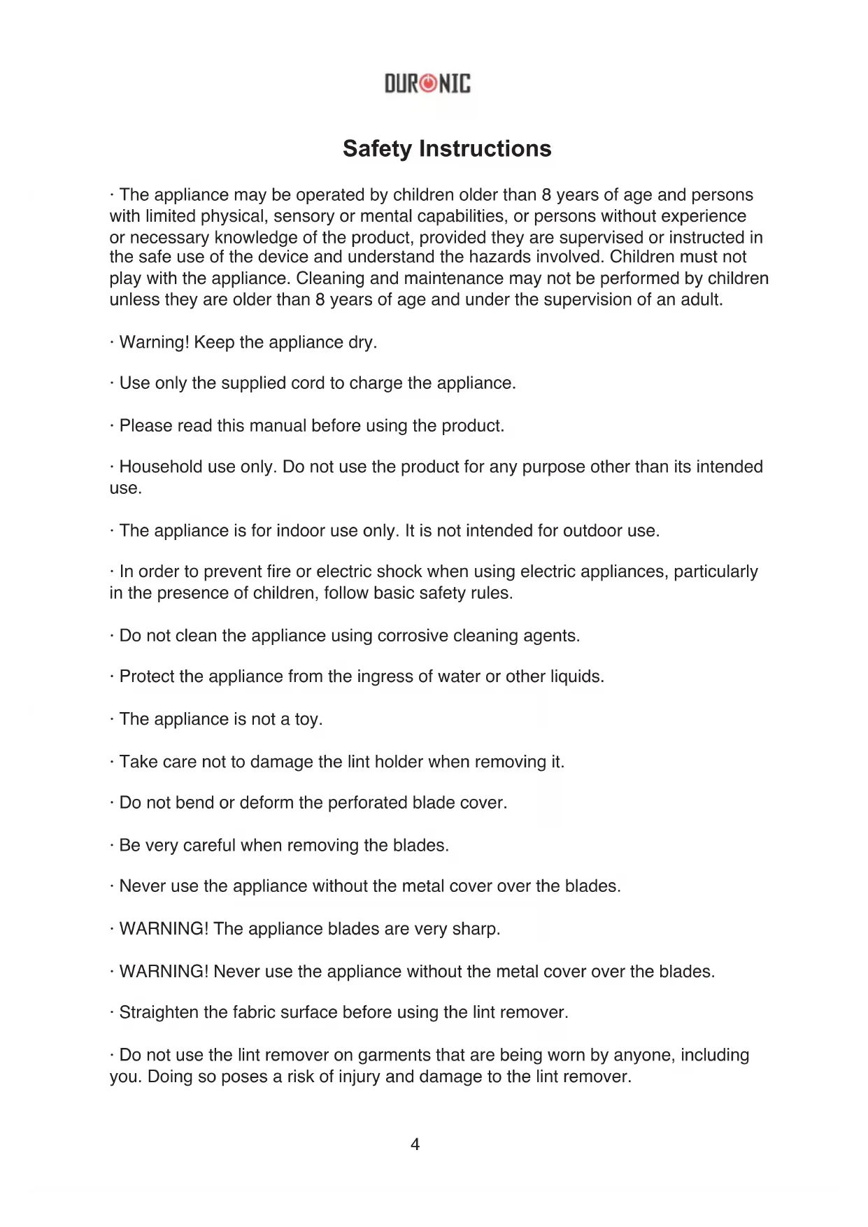 - For thin fabrics, fold two layers of garment and shave on a surface such as an ironing board.7 Instructions Setting the handle Put one hand on the handle, placing the other on the appliance head, then twist. Operating Remove the plastic cover. Turn the appliance on by pressing the on/off switch. Afterwards, the on/off switch will light up in green. Place the garment on a at surface and smooth the creases. Slide the appliance over the surface of the material. After nishing, turn off the appliance by pressing the on/off switch ON/OFF8 Cleaning When the lint container is approx. 80% full, empty it and clean the container as well as the internal blades. Cleaning the container Detach the lint container cover Remove the blades, to thoroughly clean the container. Replace the blades, Cleaning the blades. Replace the lint container cover and secure it on the appliance. Empty the container, using the supplied brush9 Cleaning the blades Carefully hold the base for attaching the blades and gently pull upwards Clean the blades and the blade cover with the supplied brush Remove the metal blade cover Replace the metal blade cover, then attach the lint container cover Carefully replace the blades on the base and push them in gently10 Warranty 1 Year Guarantee from Shine-Mart Ltd, Trademark owners of Duronic Products. NOTE: THESE STATEMENTS DO NOT AFFECT YOUR STATUTORY RIGHTS AS A CONSUMER This product has been manufactured under the strictest or quality control procedures, and using the highest quality of materials, to ensure excellent performance and reliability. It will give very good and long lasting service, provided it is properly used and maintained. The product is guaranteed for 1 years from the date of original purchase. If any defect arises due to a faulty materials or poor workmanship, the faulty product must be returned to the original place of purchase. Refund or replacement is at the discretion of that company. Duronic Products are offered with a 1 year guarantee under the following conditions: