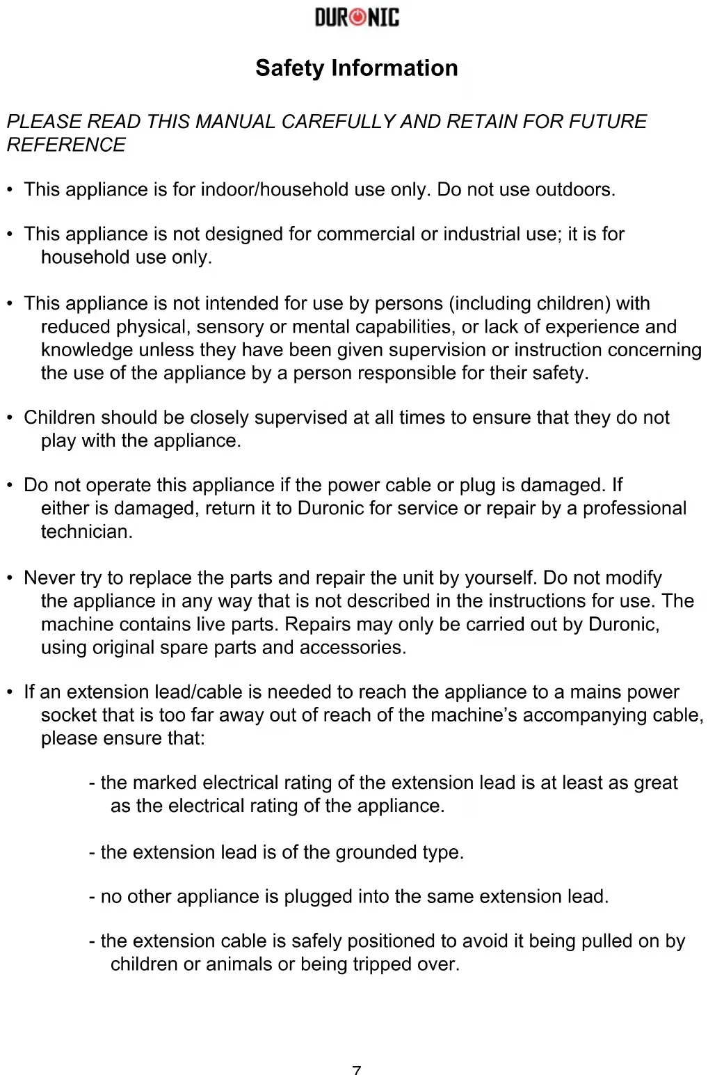 - Do not operate this appliance if the power cable or plug is damaged. If either is damaged, return it to Duronic for service or repair by a professional technician.