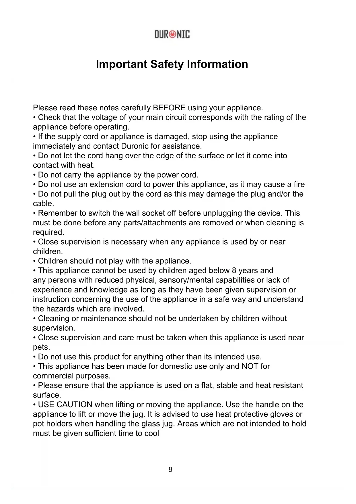 - If the supply cord or appliance is damaged, stop using the appliance immediately and contact Duronic for assistance.