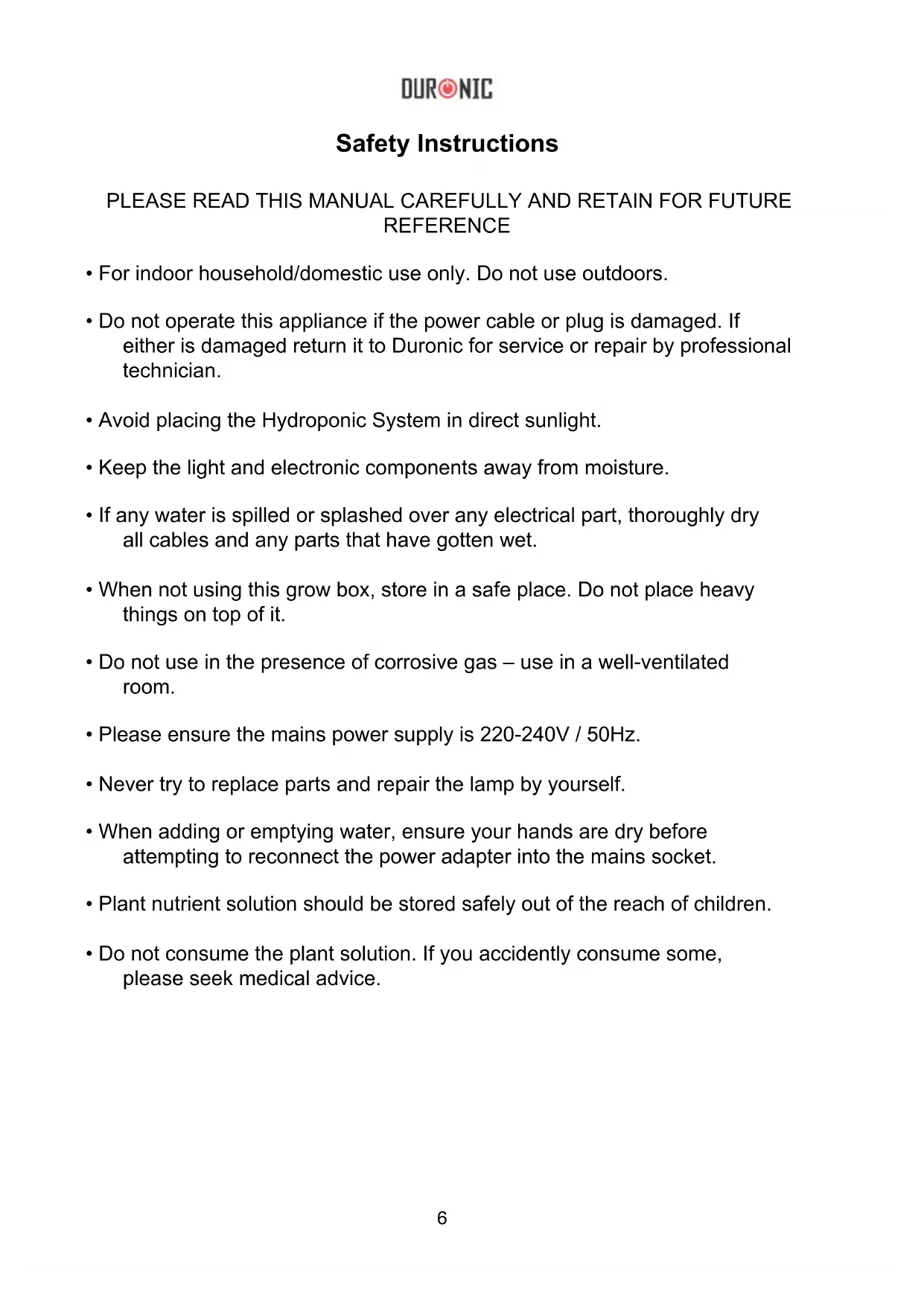 - The mixed nutrient mix (with water already added) has a storage life of 5 months if stored away from sunlight. Care and Maintenance Setting the Mode From the moment the system is connected and switched on at the plug, the power button will luminate and the lamp will be in ‘standby mode’. When you select a mode, it will turn on the lamp and activate a 24-hour clock to coincide with the cycle of the mode you have chosen. Depending on the time you rst selected the mode, this will be the same time that the light turns on every day thereafter. For instance, if you select the ‘normal mode’ at 10am for the rst use, the system will run the cycle of 14 hours lights on and then 10 hours lights off. It will then automatically turn back on at 10am the following day, and the cycle will continue for as long as desired until the unit is either turned off into ‘standby mode’ or switched off at the plug.13 Warranty 1 Year Guarantee from Shine-Mart Ltd, Trademark owners of Duronic Products. NOTE: THESE STATEMENTS DO NOT AFFECT YOUR STATUTORY RIGHTS AS A CONSUMER This product has been manufactured under the strictest or quality control procedures, and using the highest quality of materials, to ensure excellent performance and reliability. It will give very good and long lasting service, provided it is properly used and maintained. The product is guaranteed for 1 years from the date of original purchase. If any defect arises due to a faulty materials or poor workmanship, the faulty product must be returned to the original place of purchase. Refund or replacement is at the discretion of that company. Duronic Products are offered with a 1 year guarantee under the following conditions: