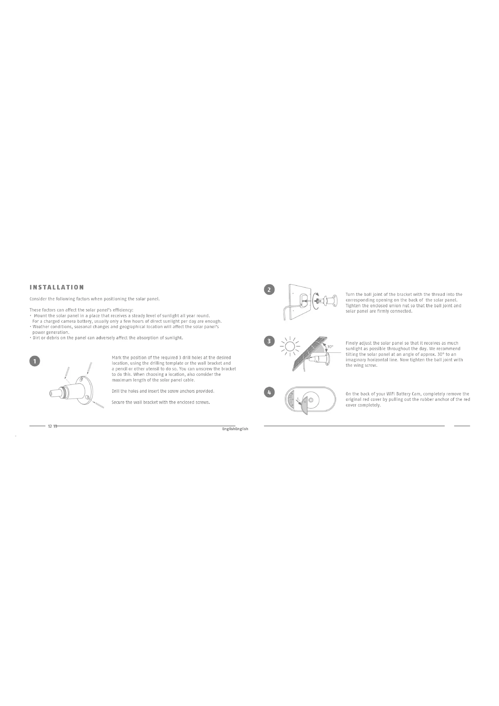 Connect the micro USB plug of the solar panel cable to the micro USB port of the Wi-Fi battery cam. Make sure that the connector is properly and rmly seated. Also make sure that the rubber seals are seated correctly to ensure waterproofness. Tip: In the live view of the app, you can see via the battery symbol - similar to the charging of a smartphone - as soon as the solar panel charges the camera battery in sunshine. Once all the components have been assembled, check again that the new cover on the back of the camera and the micro-USB connector are tted tightly so that the connection is waterproof. Depending on the mounting situation on site: You can use the cable clamps to x the cable between the solar panel and the camera to provide strain relief or as desired.16 17 English English IMPORTANT NOTES The best location for your solar panel is where... it is installed so that it receives as much sunlight as possible throughout the day: usually facing the south if in the northern hemisphere (e.g. in Europe, North America, Asia), or facing the north if in the southern hemisphere (e.g. in South America, Australia). it is aligned at an angle of approx. 30° (in relation to an imaginary horizontal line) Also note the following: