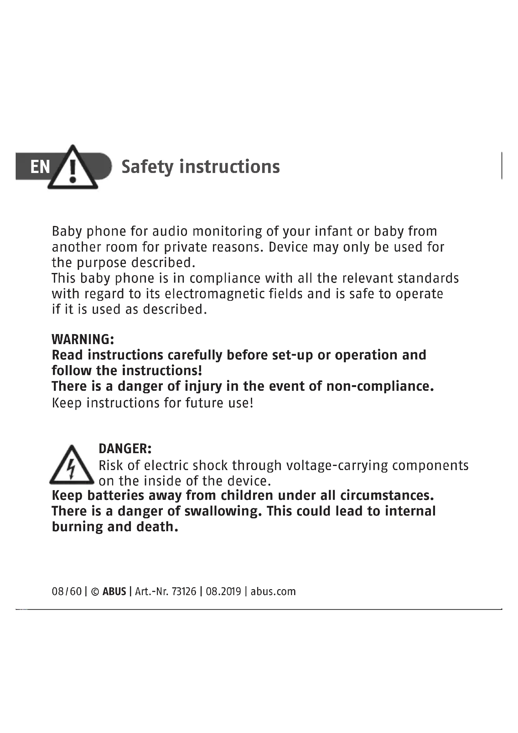 Risk of electric shock through voltage-carrying components on the inside of the device. Keep batteries away from children under all circumstances. There is a danger of swallowing. This could lead to internal burning and death. Safety instructions EN© ABUS | Art.-Nr. 73126 | 08.2019 | abus.com | 09 / 60