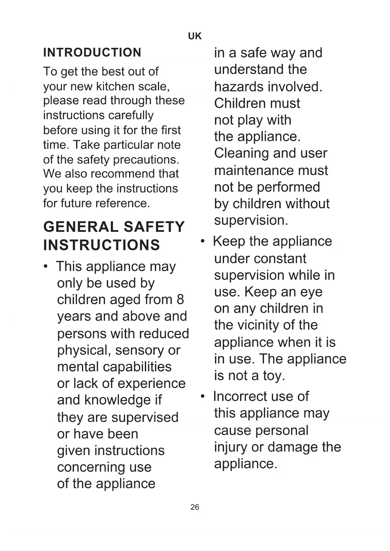 INTRODUCTION To get the best out of your new kitchen scale, please read through these instructions carefully before using it for the rst time. Take particular note of the safety precautions. We also recommend that you keep the instructions for future reference. GENERAL SAFETY INSTRUCTIONS
