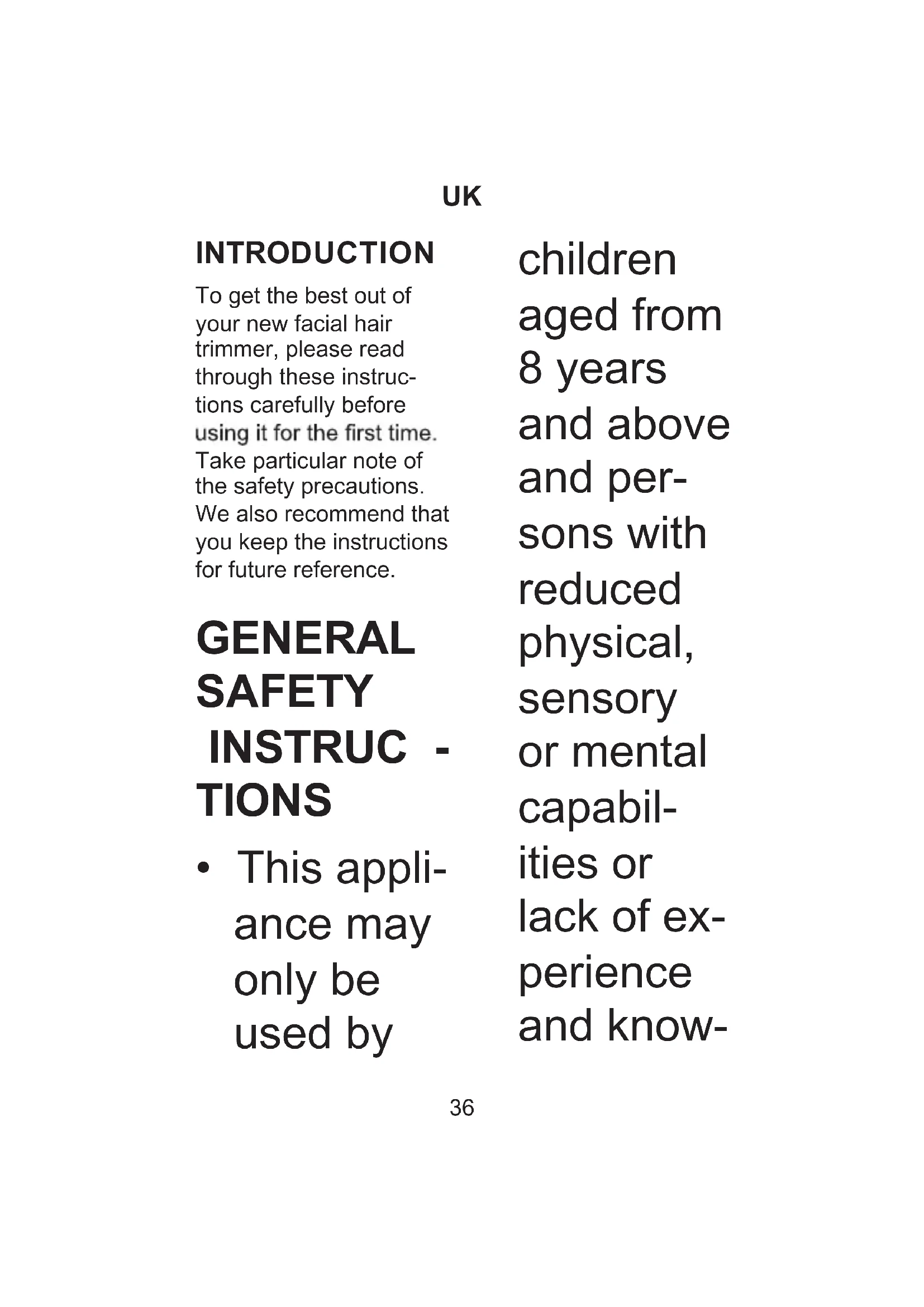 INTRODUCTION To get the best out of your new facial hair trimmer, please read through these instruc- tions carefully before Take particular note of the safety precautions. We also recommend that you keep the instructions for future reference. GENERAL SAFETY INSTRUC - TIONS