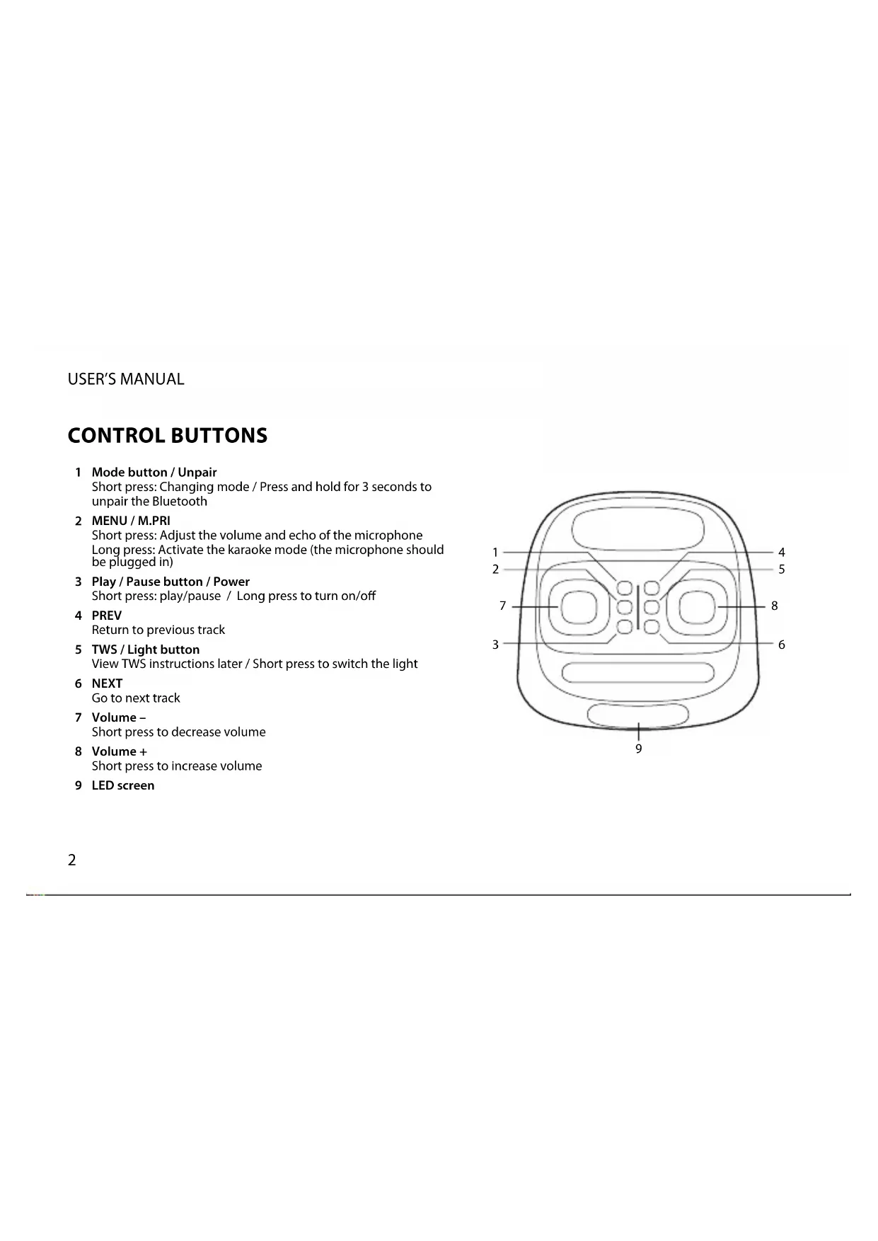 Short press: Adjust the volume and echo of the microphone Long press: Activate the karaoke mode (the microphone should be plugged in) Play / Pause button / Power Short press: play/pause / Long press to turn on/o PREV Return to previous track TWS / Light button View TWS instructions later / Short press to switch the light NEXT Go to next track Volume – Short press to decrease volume Volume + Short press to increase volume LED screen