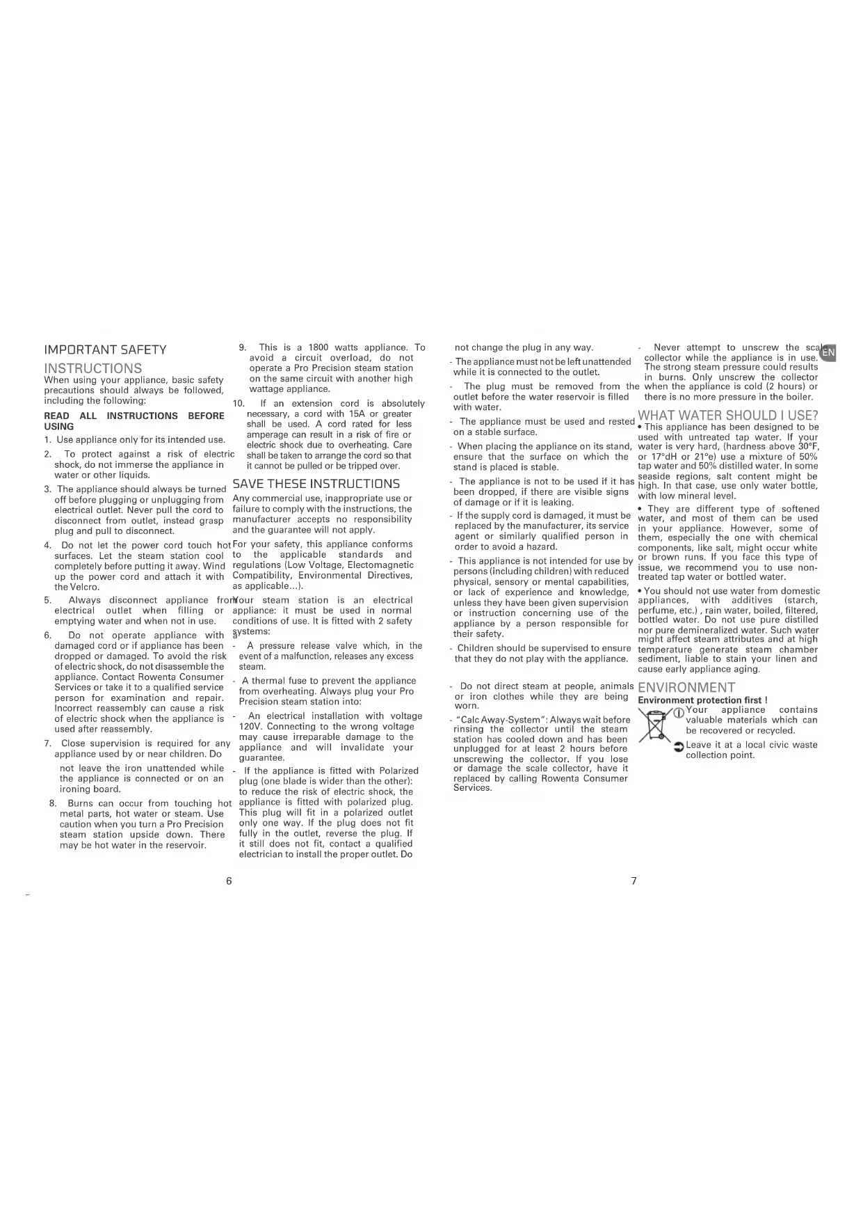 Any commercial use, inappropriate use or failure to comply with the instructions, the manufacturer accepts no responsibility and the guarantee will not apply. For your safety, this appliance conforms to the applicable standards and regulations (Low Voltage, Electomagnetic Compatibility, Environmental Directives, as applicable…). Your steam station is an electrical appliance: it must be used in normal conditions of use. It is fitted with 2 safety systems: - A pressure release valve which, in the event of a malfunction, releases any excess steam. - A thermal fuse to prevent the appliance from overheating. Always plug your Pro Precision steam station into: - An electrical installation with voltage 120V. Connecting to the wrong voltage may cause irreparable damage to the appliance and will invalidate your guarantee. - If the appliance is fitted with Polarized plug (one blade is wider than the other): to reduce the risk of electric shock, the appliance is fitted with polarized plug. This plug will fit in a polarized outlet only one way. If the plug does not fit fully in the outlet, reverse the plug. If it still does not fit, contact a qualified electrician to install the proper outlet. Do not change the plug in any way. - The appliance must not be left unattended while it is connected to the outlet. - The plug must be removed from the outlet before the water reservoir is filled with water. - The appliance must be used and rested on a stable surface. - When placing the appliance on its stand, ensure that the surface on which the stand is placed is stable. - The appliance is not to be used if it has been dropped, if there are visible signs of damage or if it is leaking. - If the supply cord is damaged, it must be replaced by the manufacturer, its service agent or similarly qualified person in order to avoid a hazard. - This appliance is not intended for use by persons (including children) with reduced physical, sensory or mental capabilities, or lack of experience and knowledge, unless they have been given supervision or instruction concerning use of the appliance by a person responsible for their safety. - Children should be supervised to ensure that they do not play with the appliance. - Do not direct steam at people, animals or iron clothes while they are being worn. - “Calc Away-System”: Always wait before rinsing the collector until the steam station has cooled down and has been unplugged for at least 2 hours before unscrewing the collector. If you lose or damage the scale collector, have it replaced by calling Rowenta Consumer Services. - Never attempt to unscrew the scale collector while the appliance is in use. The strong steam pressure could results in burns. Only unscrew the collector when the appliance is cold (2 hours) or there is no more pressure in the boiler. WHAT WATER SHOULD I USE?