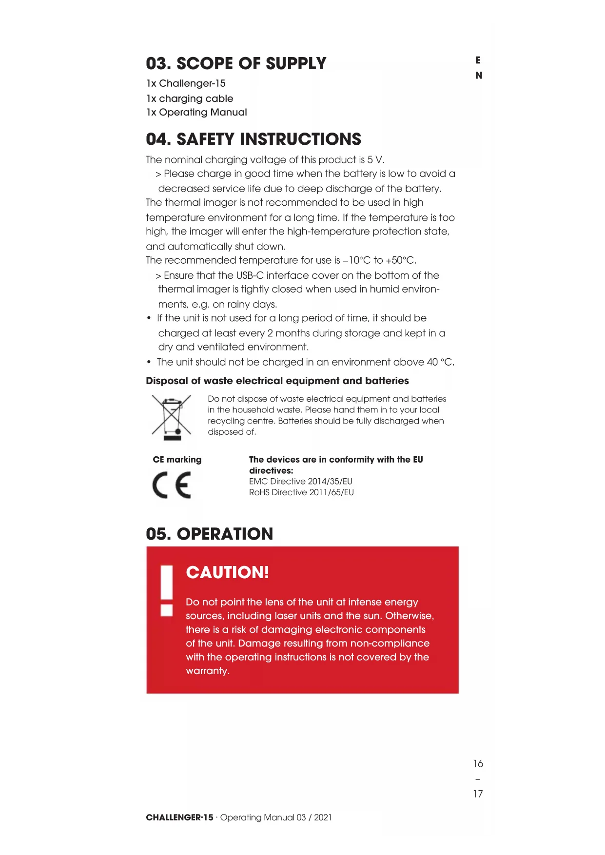 12FASCINATION THERMAL IMAGING Dear Customers, Our mission to always oer you thermal imaging optics that are at the forefront of technology and quality means that you will find products with state-of-the-art technology and outstanding performance parameters in our new range. With our service promise to return any optics you have sent in to you within ten working days, as well as a guarantee on our products of up to three years, we would like to thank you for your trust and wish you good hunting! Your LIEMKE team!CHALLENGER-15 · Operating Manual 03 / 2021