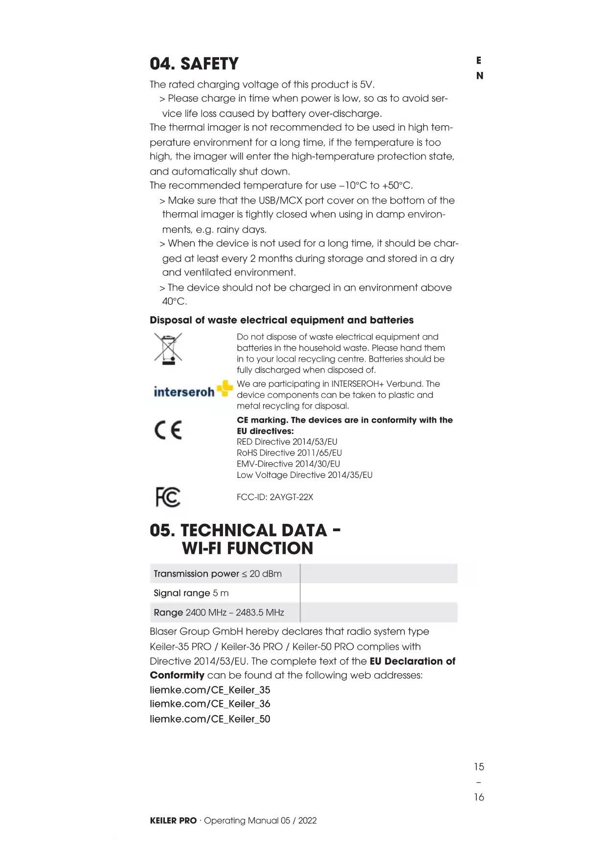 WI-FI FUNCTION Transmission power ≤ 20dBm Signal range 5 m Range 2400 MHz – 2483.5 MHz Blaser Group GmbH hereby declares that radio system type Keiler-35 PRO / Keiler-36 PRO / Keiler-50 PRO complies with Directive 2014/53/EU. The complete text of the EU Declaration of Conformity can be found at the following web addresses: liemke.com/CE_Keiler_35 liemke.com/CE_Keiler_36 liemke.com/CE_Keiler_50 1506. OPERATION ATTENTION! The lens of the device must not be pointed at any sources of intense energy, such as laser-emitting devices or the sun. This may damage the electronic components in the device. Damage caused by failure to comply with the operating guidelines is not cover- ed under warranty.