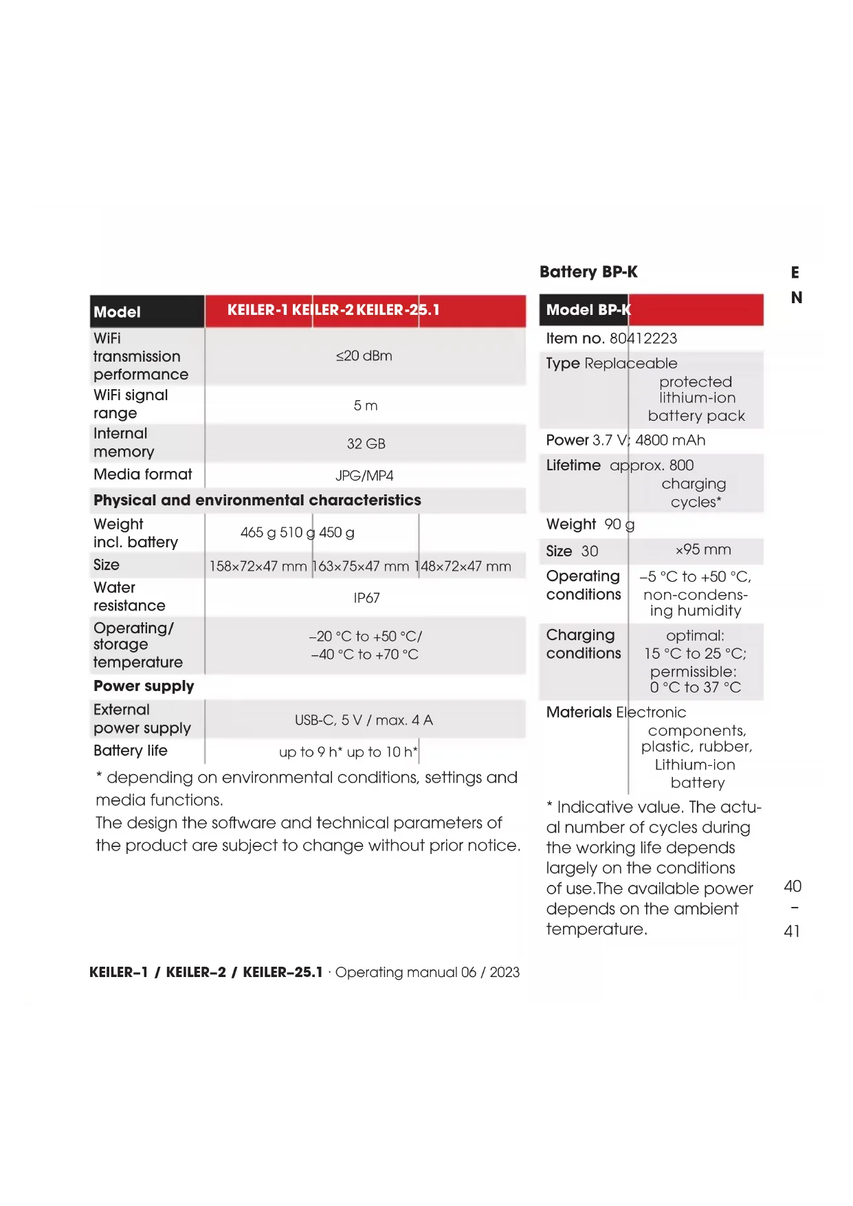 - depending on environmental conditions, settings and media functions. The design the soware and technical parameters of the product are subject to change without prior notice. Battery BP-K Model BP-K Item no. 80412223 Type Replaceable protected lithium-ion battery pack Power 3.7V; 4800mAh Lifetime approx. 800 charging cycles* Weight 90 g Size 30 ×95 mm Operating conditions −5°C to +50°C, non-condens- ing humidity Charging conditions optimal: 15 °C to 25 °C; permissible: 0°C to 37°C Materials Electronic components, plastic, rubber, Lithium-ion battery