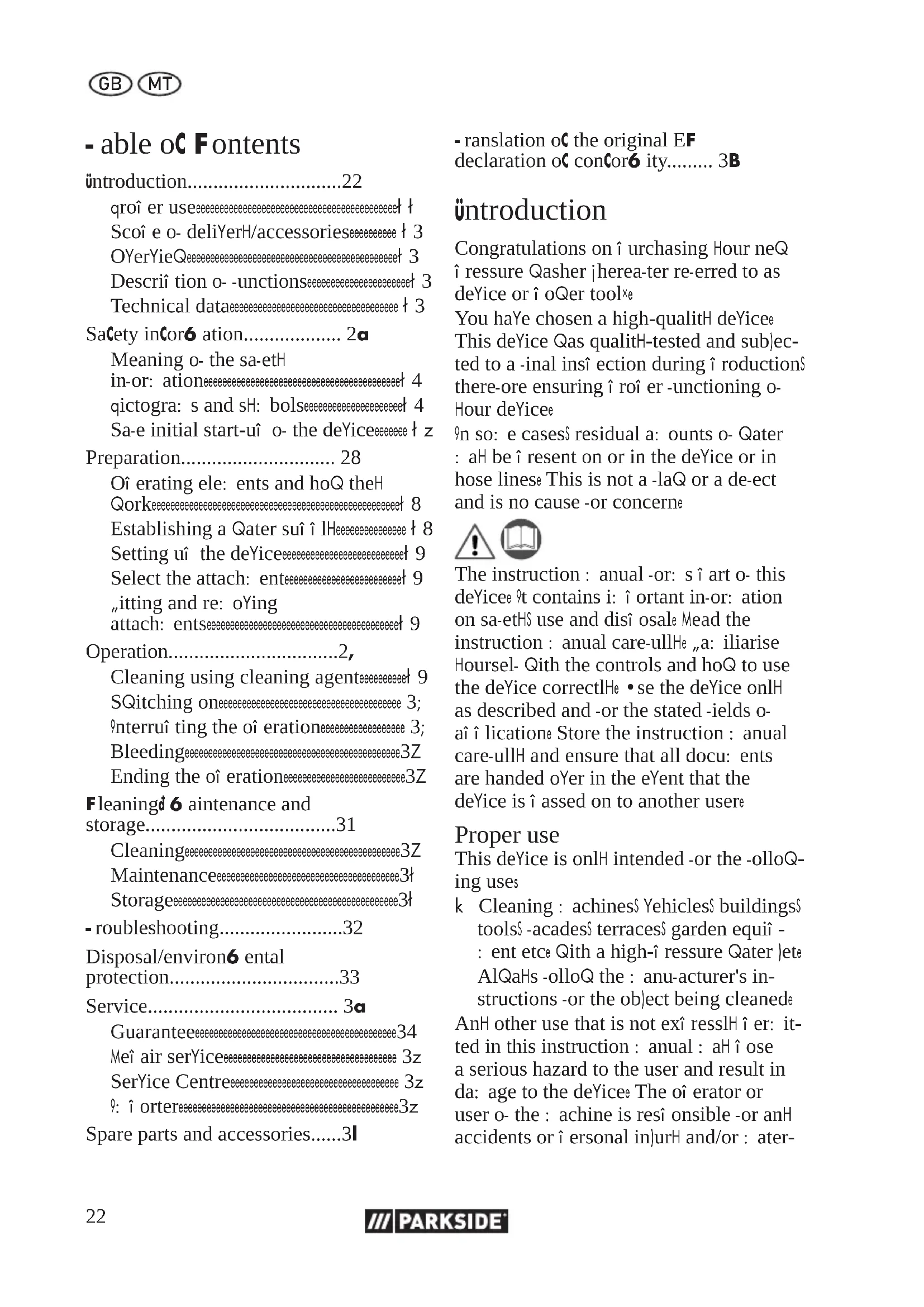 - Packaging that cannot be cleaned must be disposed of in the same way as the material. Service Guarantee Dear Customer, This product is provided with a 3 year guarantee from the date of purchase. In case of defects, you have statutory rights against the seller of the product. These statutory rights are not restricted by our guarantee presented below. Terms of Guarantee The guarantee period begins on the date of purchase. Please retain the original re- ceipt. This document is required as proof of purchase. If a material or manufacturing defect oc- curs within three years of the date of pur- chase of this product, we will repair or replace – at our choice – the product for you free of charge. This guarantee re- quires the defective product and proof of purchase to be presented within the three- year period with a brief written description of what constitutes the defect and when it occurred. If the defect is covered by our guaran- tee, you will receive either the repaired product or a new product. No new guar- antee period begins on repair or replace- ment of the product. Guarantee Period and Statutory Claims for Defects The guarantee period is not extended by the guarantee service. This also applies for replaced or repaired parts. Any dam- ages and defects already present at the time of purchase must be reported imme- diately after unpacking. Repairs arising after expiry of the guarantee period are chargeable. Guarantee Cover The product has been carefully produced in accordance with strict quality guidelines and conscientiously checked prior to deliv- ery. The guarantee applies for all material and manufacturing defects. This guarantee does not extend to cover product parts that are subject to normal wear and may therefore be considered as wearing parts (e.g. High-pressure hose) or to cover dam- age to breakable parts (e.g. switch). This guarantee shall be invalid if the product has been damaged, used incor- rectly or not maintained. Neither does it extend to damage resulting from wa- ter, frost, lightning and fire or improp- er transport. Precise adherence to all of the instructions specified in the operat- ing manual is required for proper use of the product. Intended uses and ac- tions against which the operating manu- al advises or warns must be categorically avoided. The product is designed only for private and not commercial use. The guarantee will be invalidated in case of misuse or im- proper handling, use of force, or interven- tions not undertaken by our authorised ser- vice branch.GB